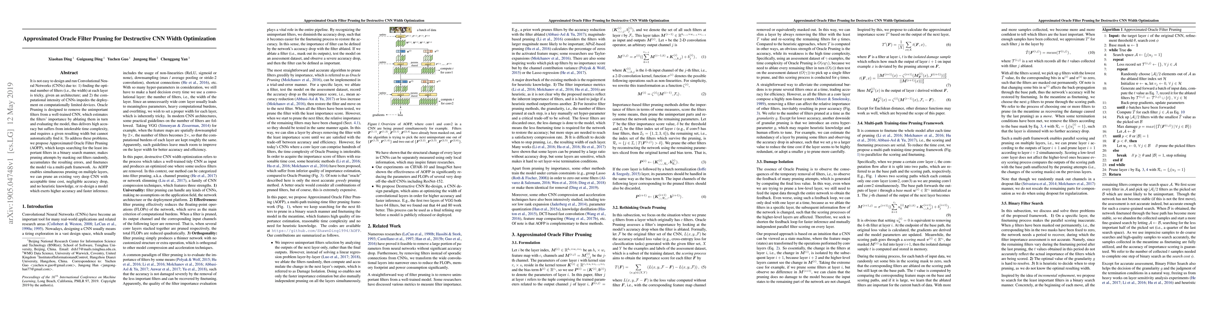 It is not easy to design and run Convolutional Neural Networks (CNNs) due to: 1) finding the optimal number of filters (i.e., the width) at each layer is tricky, given an architecture; and 2) the computational intensity of CNNs impedes the deployment on computationally limited devices. Oracle Pruning is designed to remove the unimportant filters from a well-trained CNN, which estimates the filters' importance by ablating them in turn and evaluating the model, thus delivers high accuracy but suffers from intolerable time complexity, and requires a given resulting width but cannot automatically find it. To address these problems, we propose Approximated Oracle Filter Pruning (AOFP), which keeps searching for the least important filters in a binary search manner, makes pruning attempts by masking out filters randomly, accumulates the resulting errors, and finetunes the model via a multi-path framework. As AOFP enables simultaneous pruning on multiple layers, we can prune an existing very deep CNN with acceptable time cost, negligible accuracy drop, and no heuristic knowledge, or re-design a model which exerts higher accuracy and faster inference.