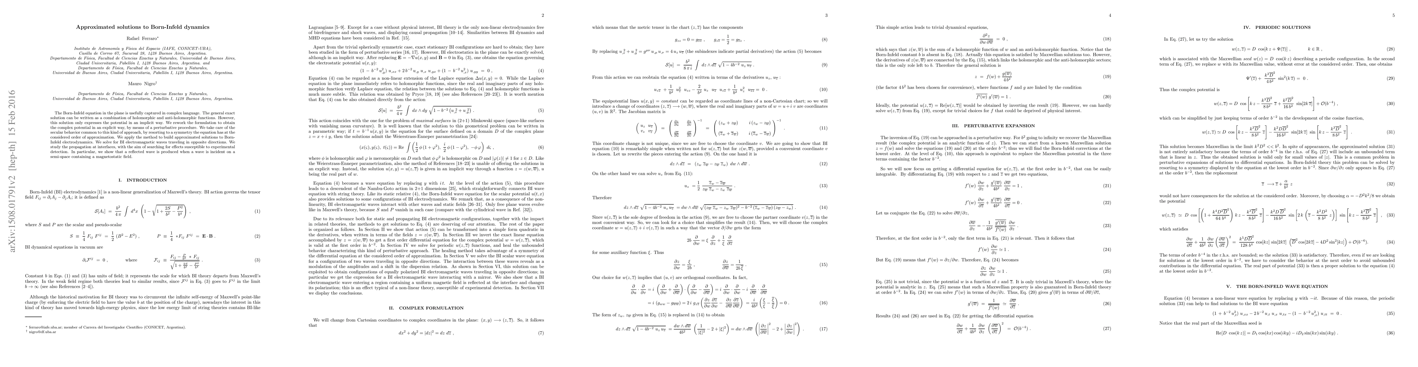 The Born-Infeld equation in the plane is usefully captured in complex language. The general exact solution can be written as a combination of holomorphic and anti-holomorphic functions. However, this solution only expresses the potential in an implicit way. We rework the formulation to obtain the complex potential in an explicit way, by means of a perturbative procedure. We take care of the secular behavior common to this kind of approach, by resorting to a symmetry the equation has at the considered order of approximation. We apply the method to build approximated solutions to Born-Infeld electrodynamics. We solve for BI electromagnetic waves traveling in opposite directions. We study the propagation at interfaces, with the aim of searching for effects susceptible to experimental detection. In particular, we show that a reflected wave is produced when a wave is incident on a semi-space containing a magnetostatic field.