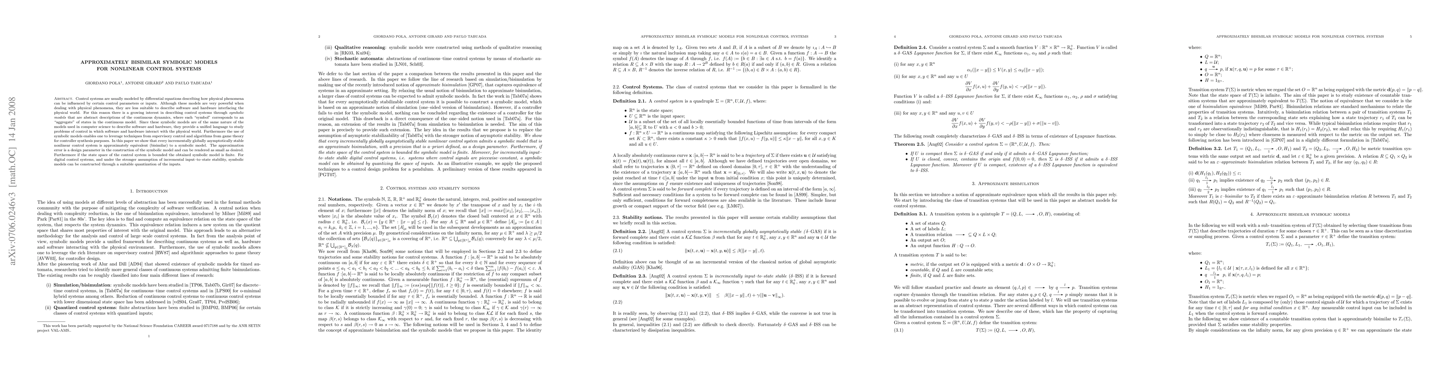 This paper proposes that nonlinear control systems can be modeled using symbolic models that abstract continuous dynamics, enabling a unified language for studying interactions between software, hardware, and the physical world. It demonstrates that any incrementally globally asymptotically stable nonlinear control system can be approximated by a symbolic model with controllable approximation error, and if the state space is bounded, the symbolic model is finite.