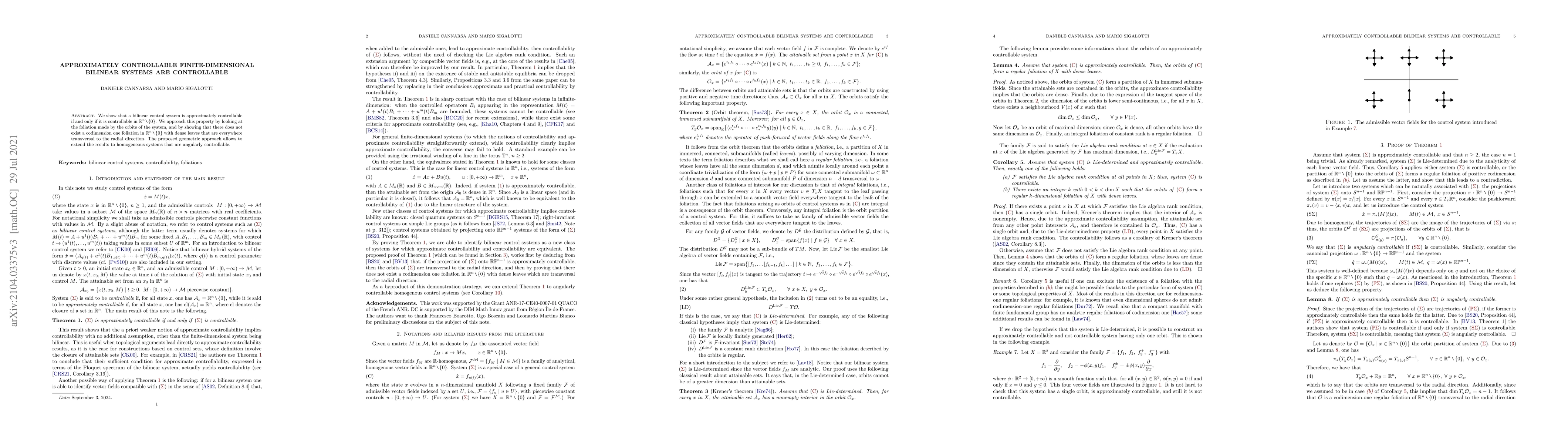 We show that a bilinear control system is approximately controllable if and only if it is controllable in $\mathbb{R}^{n}\setminus\{0\}$. We approach this problem by looking at the foliation made by the orbits of the system, and by showing that there does not exist a codimension-one foliation in $\mathbb{R}^{n}\setminus\{0\}$ with dense leaves that are everywhere transversal to the radial direction. The proposed geometric approach allows to extend the results to homogeneous systems that are angularly controllable.