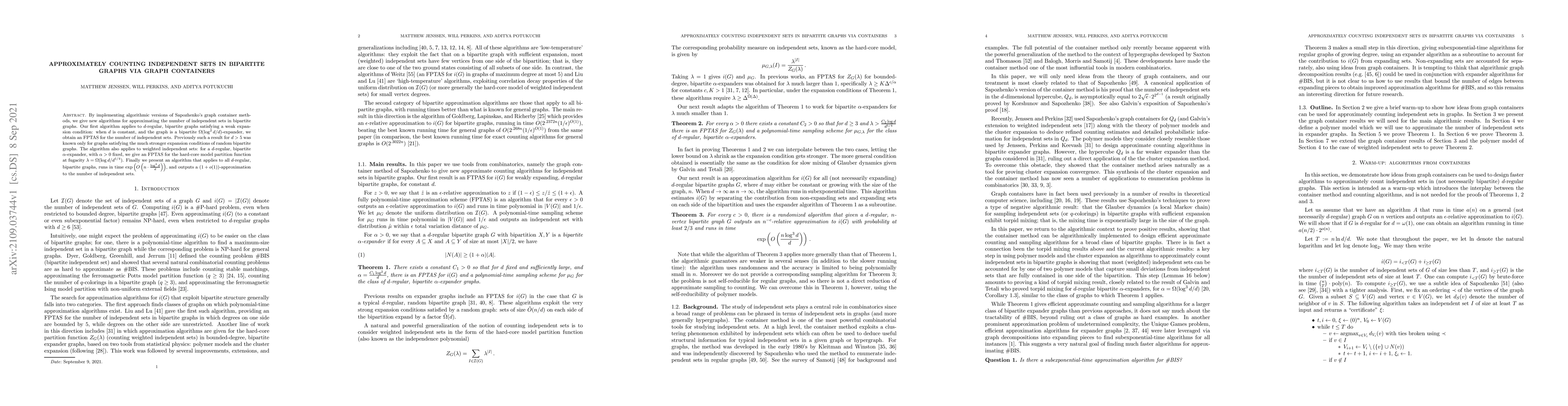 This paper presents new algorithms for approximating the number of independent sets in $d$-regular bipartite graphs using graph container methods. The authors achieve an FPTAS for bipartite $\Omega(\log^2 d/d)$-expanders when $d$ is constant, and extend the result to weighted independent sets and all $d$-regular bipartite graphs with an exponential time approximation algorithm.