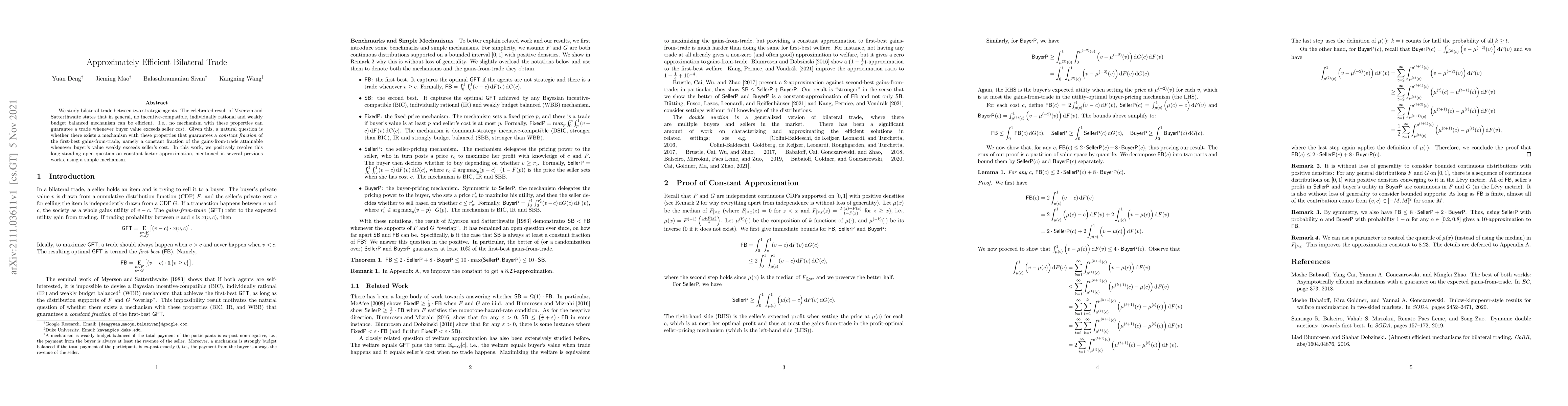 This paper proposes a simple mechanism that achieves a constant fraction of the first-best trade efficiency in bilateral trade between two strategic agents, addressing the long-standing open question of whether such an approximately efficient, incentive-compatible, and individually rational mechanism exists.