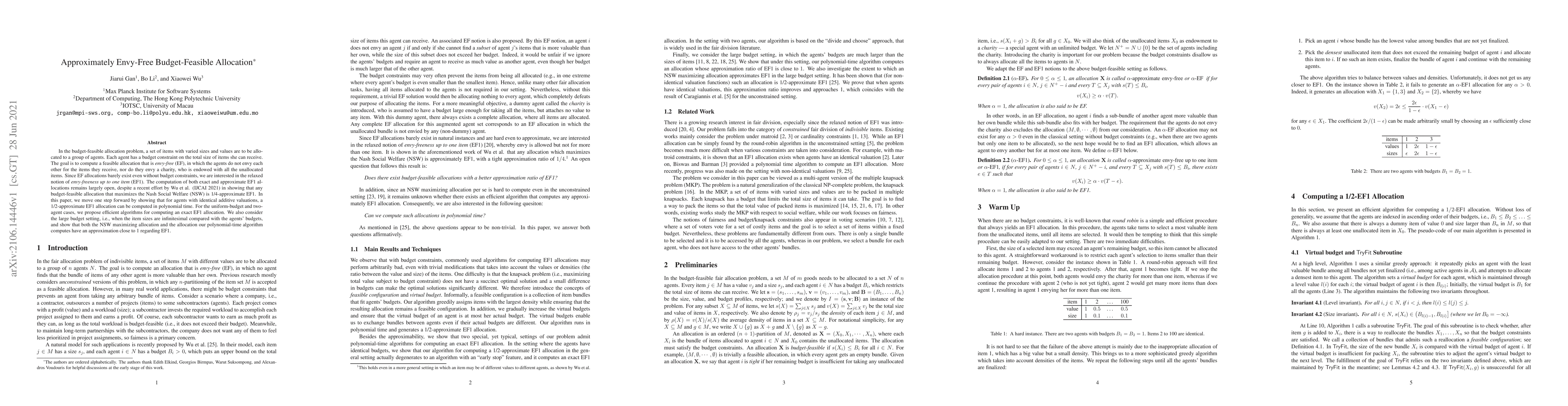 In the budget-feasible allocation problem, a set of items with varied sizes and values are to be allocated to a group of agents. Each agent has a budget constraint on the total size of items she can receive. The goal is to compute a feasible allocation that is envy-free (EF), in which the agents do not envy each other for the items they receive, nor do they envy a charity, who is endowed with all the unallocated items. Since EF allocations barely exist even without budget constraints, we are interested in the relaxed notion of envy-freeness up to one item (EF1). The computation of both exact and approximate EF1 allocations remains largely open, despite a recent effort by Wu et al. (IJCAI 2021) in showing that any budget-feasible allocation that maximizes the Nash Social Welfare (NSW) is 1/4-approximate EF1. In this paper, we move one step forward by showing that for agents with identical additive valuations, a 1/2-approximate EF1 allocation can be computed in polynomial time. For the uniform-budget and two-agent cases, we propose efficient algorithms for computing an exact EF1 allocation. We also consider the large budget setting, i.e., when the item sizes are infinitesimal compared with the agents' budgets, and show that both the NSW maximizing allocation and the allocation our polynomial-time algorithm computes have an approximation close to 1 regarding EF1.