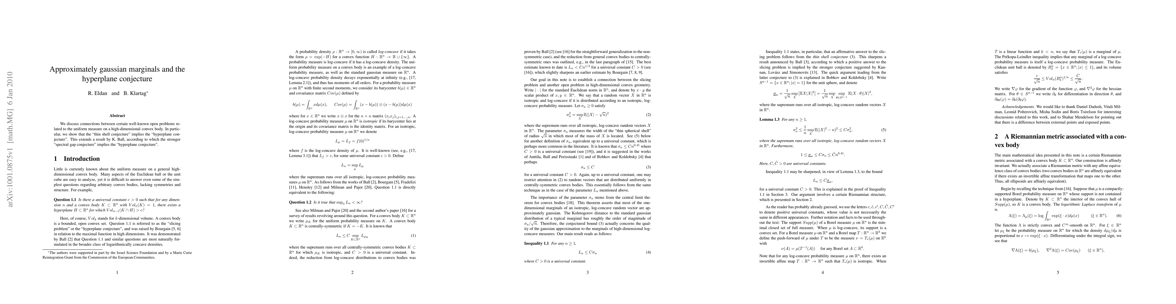 We discuss connections between certain well-known open problems related to the uniform measure on a high-dimensional convex body. In particular, we show that the "thin shell conjecture" implies the "hyperplane conjecture". This extends a result by K. Ball, according to which the stronger "spectral gap conjecture" implies the "hyperplane conjecture".
