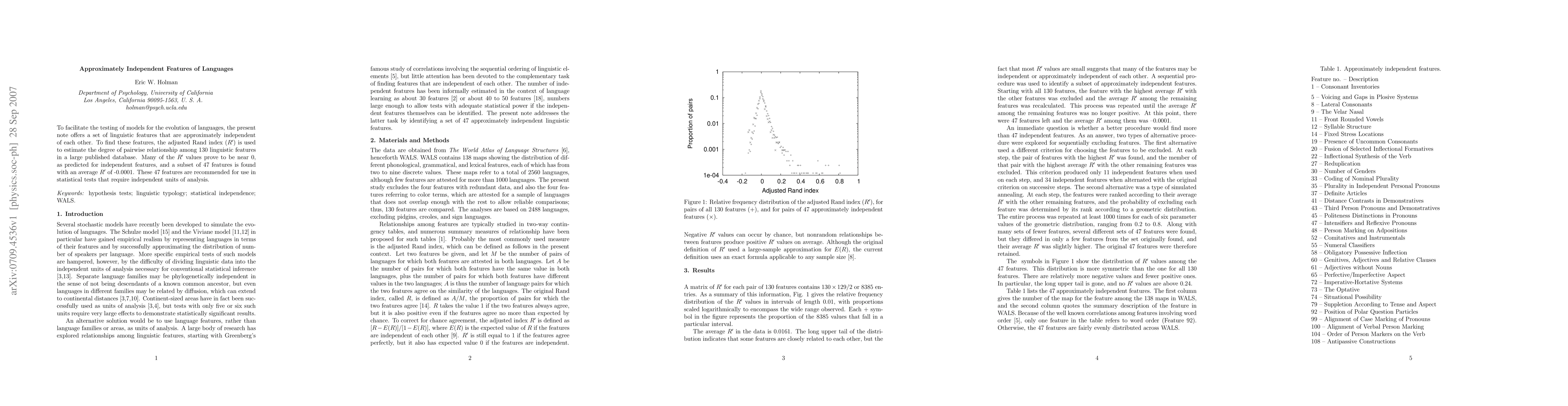 To facilitate the testing of models for the evolution of languages, the present note offers a set of linguistic features that are approximately independent of each other. To find these features, the adjusted Rand index R' is used to estimate the degree of pairwise relationship among 130 linguistic features in a large published database. Many of the R' values prove to be near 0, as predicted for independent features, and a subset of 47 features is found with an average R' of -0.0001. These 47 features are recommended for use in statistical tests that require independent units of analysis.