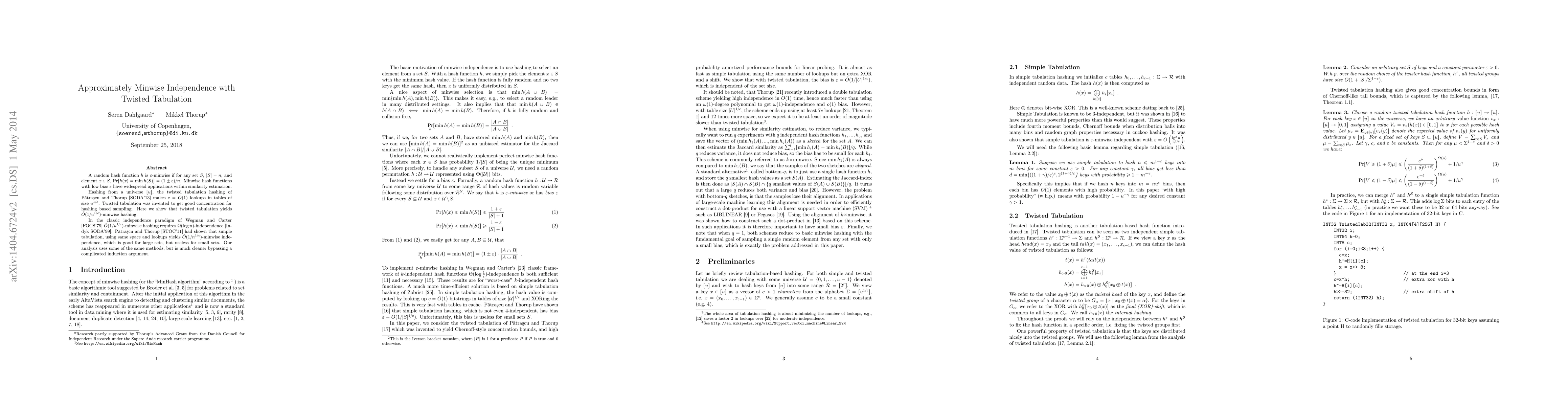 A random hash function $h$ is $\varepsilon$-minwise if for any set $S$, $|S|=n$, and element $x\in S$, $\Pr[h(x)=\min h(S)]=(1\pm\varepsilon)/n$. Minwise hash functions with low bias $\varepsilon$ have widespread applications within similarity estimation. Hashing from a universe $[u]$, the twisted tabulation hashing of P\v{a}tra\c{s}cu and Thorup [SODA'13] makes $c=O(1)$ lookups in tables of size $u^{1/c}$. Twisted tabulation was invented to get good concentration for hashing based sampling. Here we show that twisted tabulation yields $\tilde O(1/u^{1/c})$-minwise hashing. In the classic independence paradigm of Wegman and Carter [FOCS'79] $\tilde O(1/u^{1/c})$-minwise hashing requires $\Omega(\log u)$-independence [Indyk SODA'99]. P\v{a}tra\c{s}cu and Thorup [STOC'11] had shown that simple tabulation, using same space and lookups yields $\tilde O(1/n^{1/c})$-minwise independence, which is good for large sets, but useless for small sets. Our analysis uses some of the same methods, but is much cleaner bypassing a complicated induction argument.