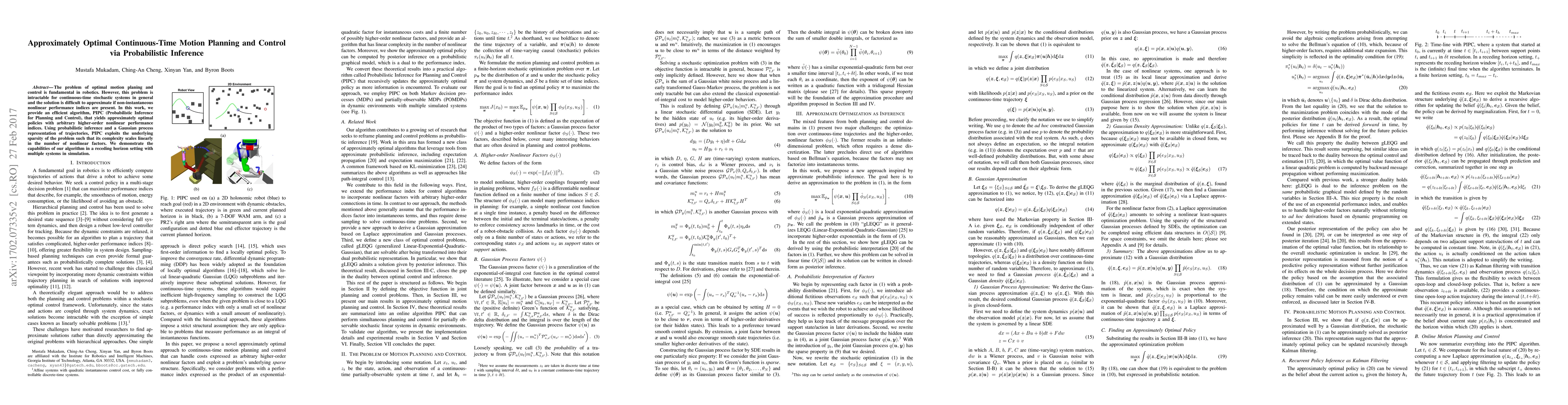 This paper introduces PIPC, an efficient algorithm for approximately optimal continuous-time motion planning and control in stochastic systems, leveraging probabilistic inference and Gaussian processes. PIPC scales linearly with the number of nonlinear factors, demonstrating its effectiveness through simulations involving multiple systems.