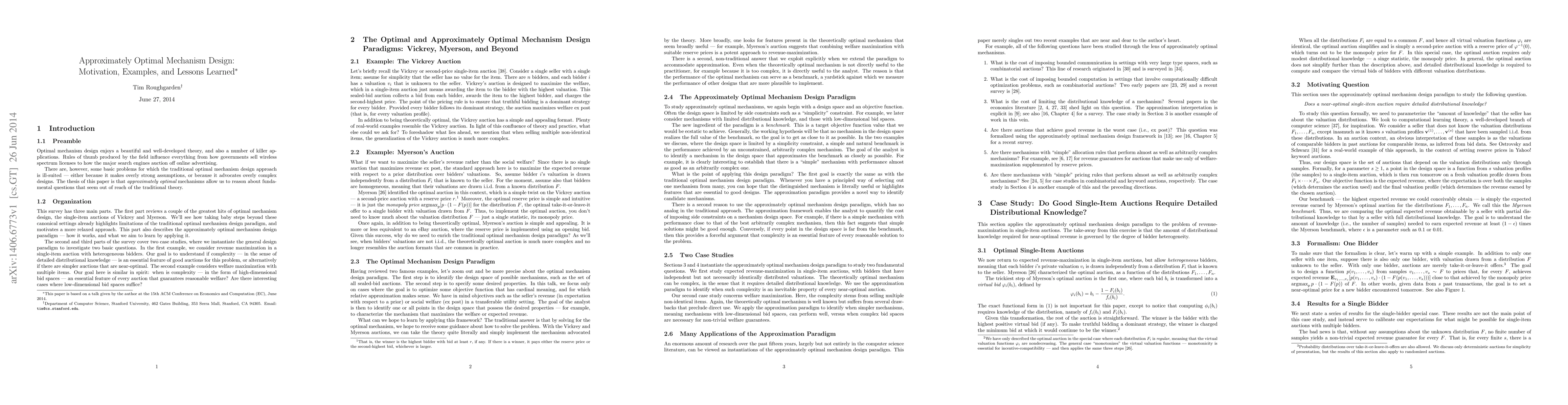 Optimal mechanism design enjoys a beautiful and well-developed theory, and also a number of killer applications. Rules of thumb produced by the field influence everything from how governments sell wireless spectrum licenses to how the major search engines auction off online advertising. There are, however, some basic problems for which the traditional optimal mechanism design approach is ill-suited --- either because it makes overly strong assumptions, or because it advocates overly complex designs. The thesis of this paper is that approximately optimal mechanisms allow us to reason about fundamental questions that seem out of reach of the traditional theory. This survey has three main parts. The first part describes the approximately optimal mechanism design paradigm --- how it works, and what we aim to learn by applying it. The second and third parts of the survey cover two case studies, where we instantiate the general design paradigm to investigate two basic questions. In the first example, we consider revenue maximization in a single-item auction with heterogeneous bidders. Our goal is to understand if complexity --- in the sense of detailed distributional knowledge --- is an essential feature of good auctions for this problem, or alternatively if there are simpler auctions that are near-optimal. The second example considers welfare maximization with multiple items. Our goal here is similar in spirit: when is complexity --- in the form of high-dimensional bid spaces --- an essential feature of every auction that guarantees reasonable welfare? Are there interesting cases where low-dimensional bid spaces suffice?