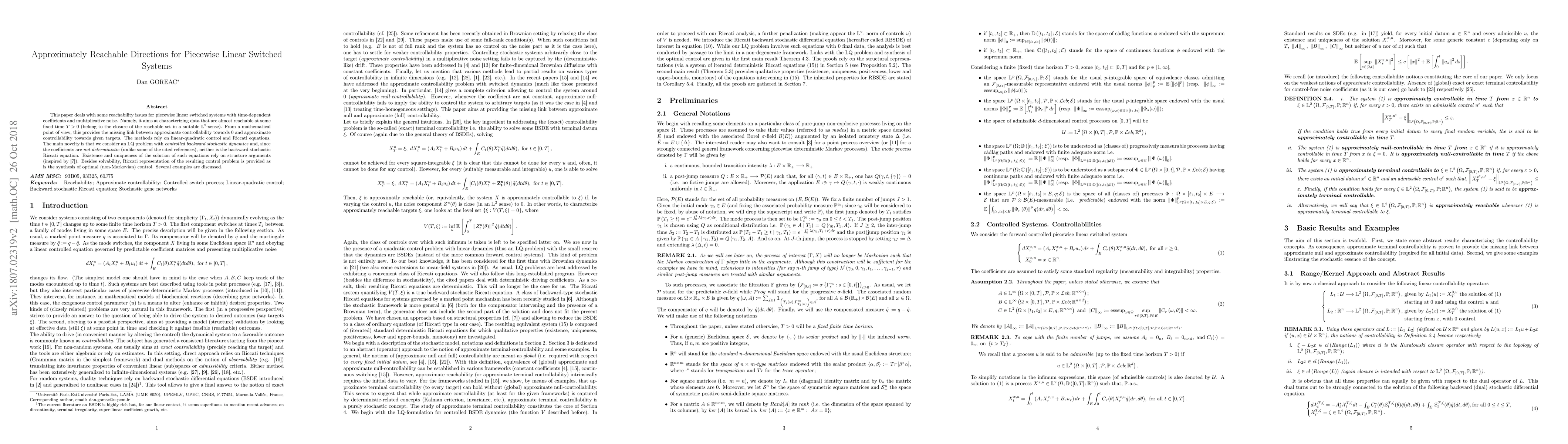 This paper deals with some reachability issues for piecewise linear switched systems with time-dependent coefficients and multiplicative noise. Namely, it aims at characterizing data that are almost reachable at some fixed time T > 0 (belong to the closure of the reachable set in a suitable L 2-sense). From a mathematical point of view, this provides the missing link between approximate controllability towards 0 and approximate controllability towards given targets. The methods rely on linear-quadratic control and Riccati equations. The main novelty is that we consider an LQ problem with controlled backward stochastic dynamics and, since the coefficients are not deterministic (unlike some of the cited references), neither is the backward stochastic Riccati equation. Existence and uniqueness of the solution of such equations rely on structure arguments (inspired by [7]). Besides solvability, Riccati representation of the resulting control problem is provided as is the synthesis of optimal (non-Markovian) control. Several examples are discussed.