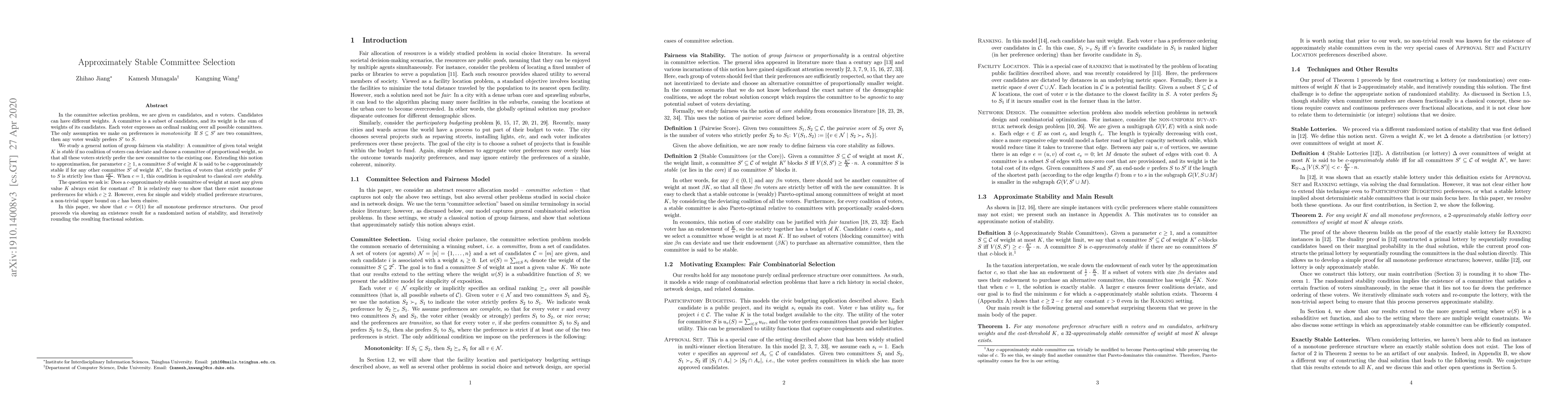 The paper investigates the existence of a committee with certain stability properties, finding that for all monotone preference structures, there exists a committee that is approximately stable for any constant value of c.