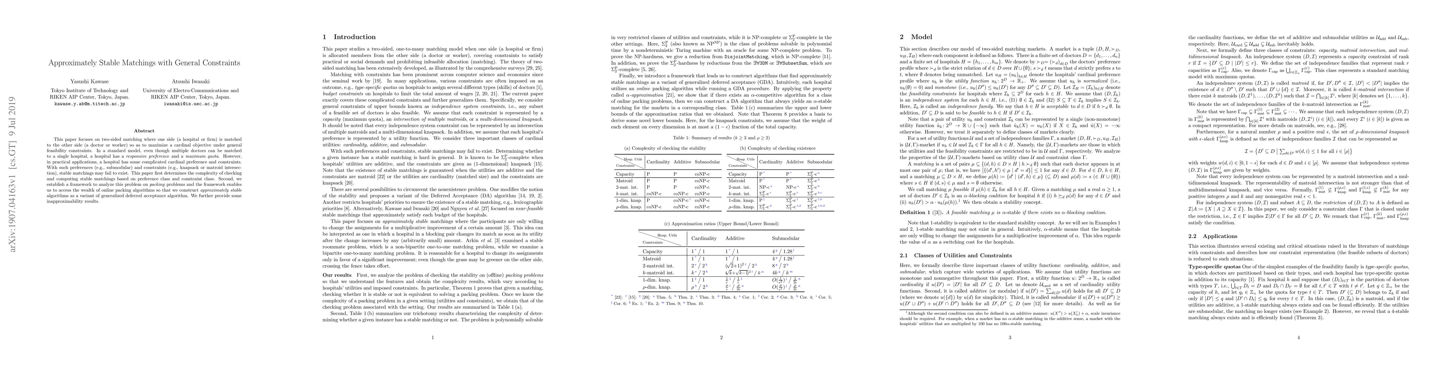 This paper focuses on two-sided matching where one side (a hospital or firm) is matched to the other side (a doctor or worker) so as to maximize a cardinal objective under general feasibility constraints. In a standard model, even though multiple doctors can be matched to a single hospital, a hospital has a responsive preference and a maximum quota. However, in practical applications, a hospital has some complicated cardinal preference and constraints. With such preferences (e.g., submodular) and constraints (e.g., knapsack or matroid intersection), stable matchings may fail to exist. This paper first determines the complexity of checking and computing stable matchings based on preference class and constraint class. Second, we establish a framework to analyze this problem on packing problems and the framework enables us to access the wealth of online packing algorithms so that we construct approximately stable algorithms as a variant of generalized deferred acceptance algorithm. We further provide some inapproximability results.