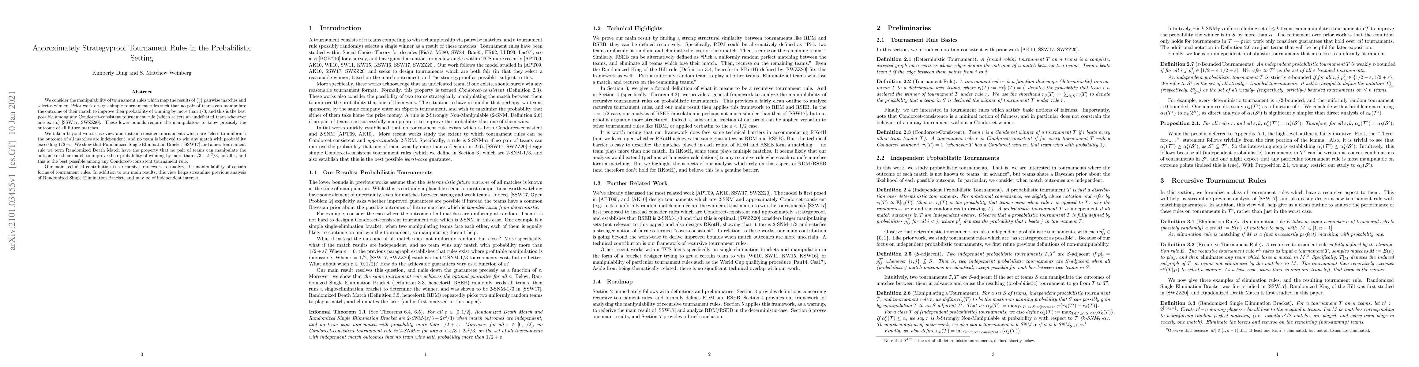 This paper explores tournament rules that minimize manipulability in probabilistic settings where match outcomes are independent. It demonstrates that Randomized Single Elimination Bracket and a new rule, Randomized Death Match, ensure no pair of teams can manipulate their match outcome to improve their winning probability by more than $\varepsilon/3 + 2\varepsilon^2/3$, providing the best possible result among Condorcet-consistent rules.