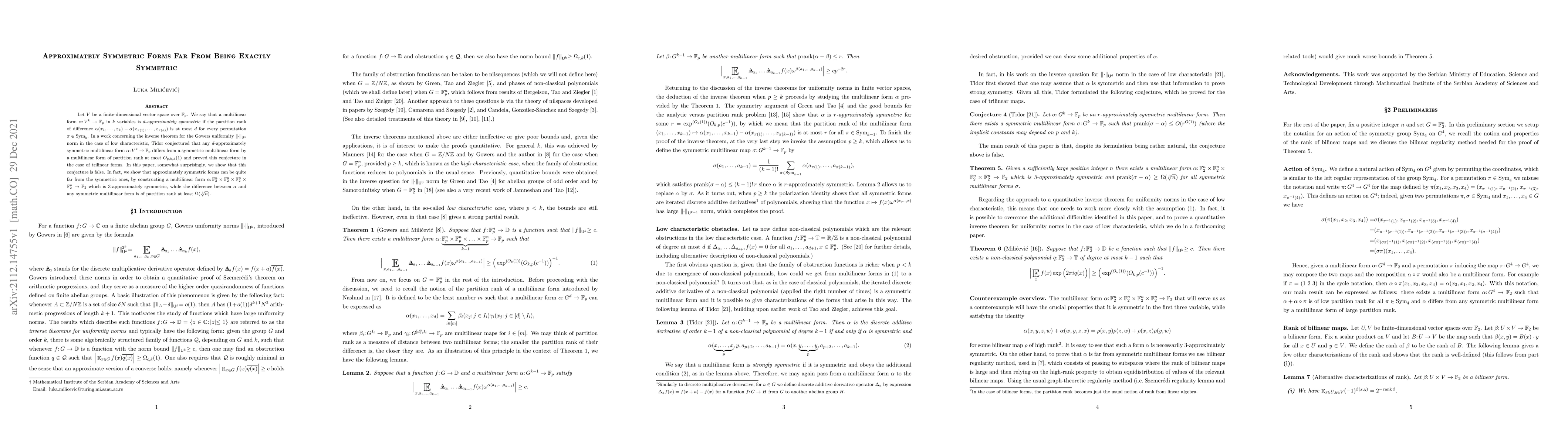 Let $V$ be a finite-dimensional vector space over $\mathbb{F}_p$. We say that a multilinear form $\alpha \colon V^k \to \mathbb{F}_p$ in $k$ variables is $d$-approximately symmetric if the partition rank of difference $\alpha(x_1, \dots, x_k) - \alpha(x_{\pi(1)}, \dots, x_{\pi(k)})$ is at most $d$ for every permutation $\pi \in \operatorname{Sym}_k$. In a work concerning the inverse theorem for the Gowers uniformity $\|\cdot\|_{\mathsf{U}^4}$ norm in the case of low characteristic, Tidor conjectured that any $d$-approximately symmetric multilinear form $\alpha \colon V^k \to \mathbb{F}_p$ differs from a symmetric multilinear form by a multilinear form of partition rank at most $O_{p,k,d}(1)$ and proved this conjecture in the case of trilinear forms. In this paper, somewhat surprisingly, we show that this conjecture is false. In fact, we show that approximately symmetric forms can be quite far from the symmetric ones, by constructing a multilinear form $\alpha \colon \mathbb{F}_2^n \times \mathbb{F}_2^n \times \mathbb{F}_2^n \times \mathbb{F}_2^n \to \mathbb{F}_2$ which is 3-approximately symmetric, while the difference between $\alpha$ and any symmetric multilinear form is of partition rank at least $\Omega(\sqrt[3]{n})$.