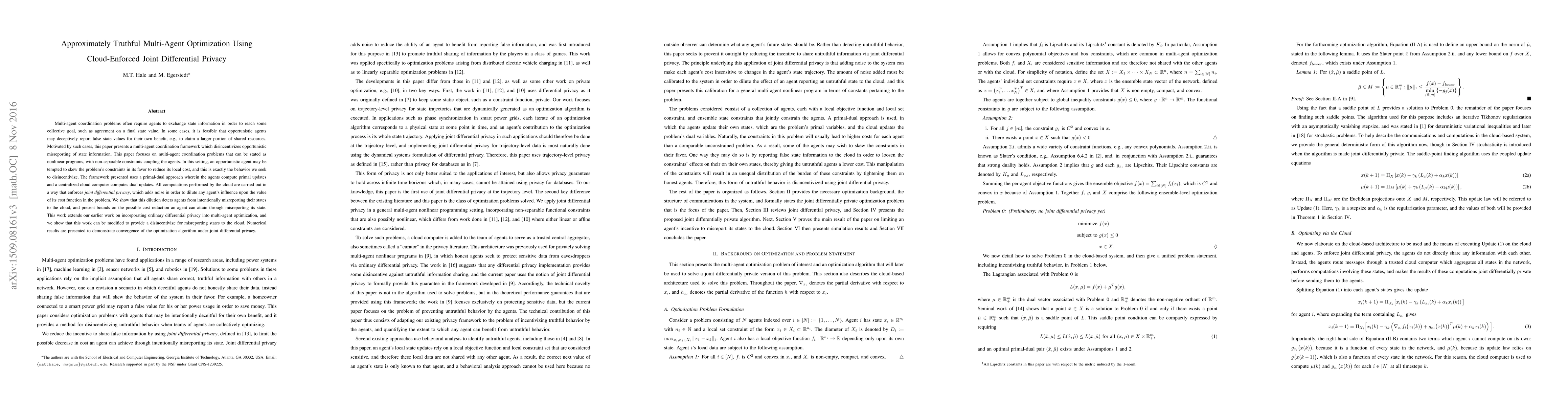 The paper introduces a cloud-enforced joint differential privacy mechanism for multi-agent optimization, ensuring truthful reporting of state information by diluting individual agent influence through added noise.