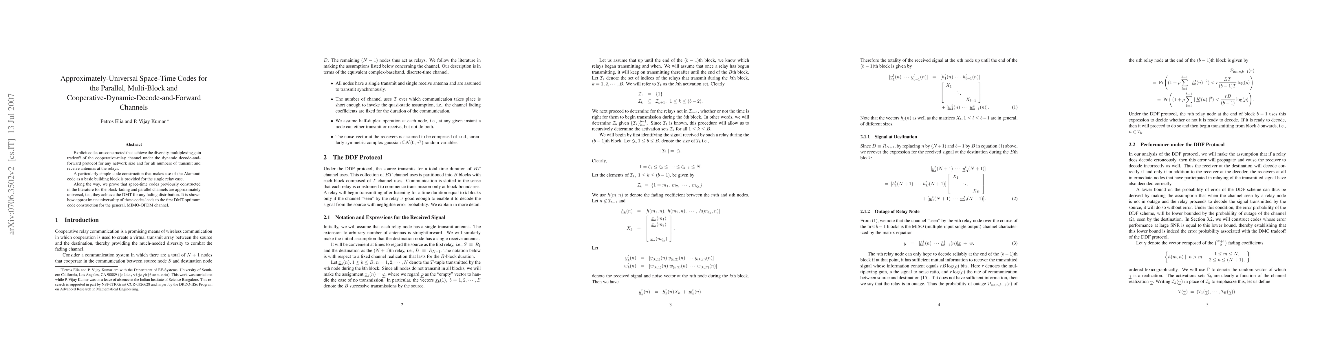 Explicit codes are constructed that achieve the diversity-multiplexing gain tradeoff of the cooperative-relay channel under the dynamic decode-and-forward protocol for any network size and for all numbers of transmit and receive antennas at the relays. A particularly simple code construction that makes use of the Alamouti code as a basic building block is provided for the single relay case. Along the way, we prove that space-time codes previously constructed in the literature for the block-fading and parallel channels are approximately universal, i.e., they achieve the DMT for any fading distribution. It is shown how approximate universality of these codes leads to the first DMT-optimum code construction for the general, MIMO-OFDM channel.