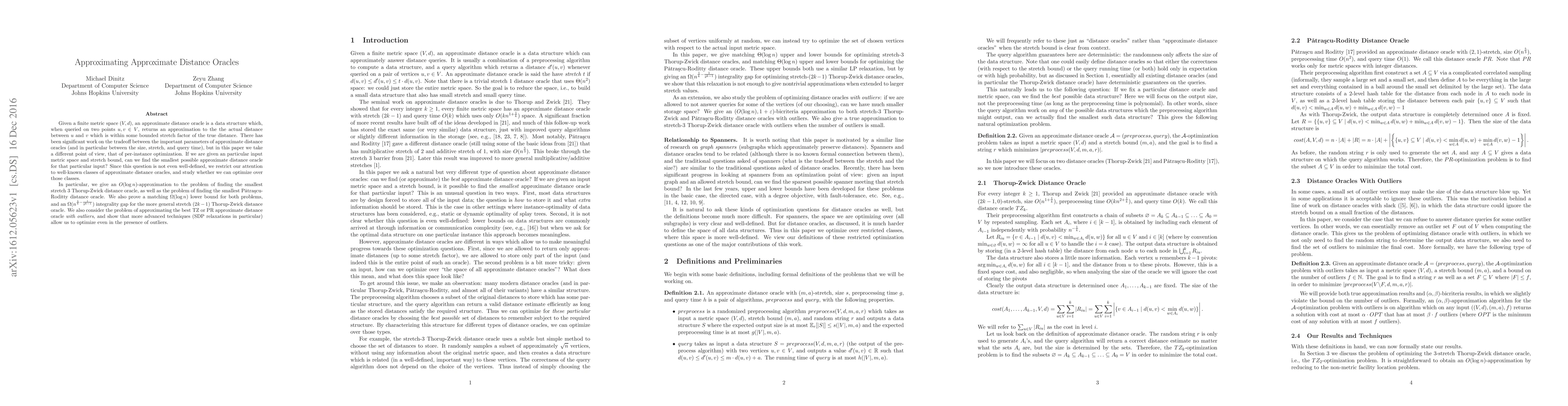 Given a finite metric space $(V,d)$, an approximate distance oracle is a data structure which, when queried on two points $u,v \in V$, returns an approximation to the the actual distance between $u$ and $v$ which is within some bounded stretch factor of the true distance. There has been significant work on the tradeoff between the important parameters of approximate distance oracles (and in particular between the size, stretch, and query time), but in this paper we take a different point of view, that of per-instance optimization. If we are given an particular input metric space and stretch bound, can we find the smallest possible approximate distance oracle for that particular input? Since this question is not even well-defined, we restrict our attention to well-known classes of approximate distance oracles, and study whether we can optimize over those classes. In particular, we give an $O(\log n)$-approximation to the problem of finding the smallest stretch $3$ Thorup-Zwick distance oracle, as well as the problem of finding the smallest P\v{a}tra\c{s}cu-Roditty distance oracle. We also prove a matching $\Omega(\log n)$ lower bound for both problems, and an $\Omega(n^{\frac{1}{k}-\frac{1}{2^{k-1}}})$ integrality gap for the more general stretch $(2k-1)$ Thorup-Zwick distance oracle. We also consider the problem of approximating the best TZ or PR approximate distance oracle \emph{with outliers}, and show that more advanced techniques (SDP relaxations in particular) allow us to optimize even in the presence of outliers.