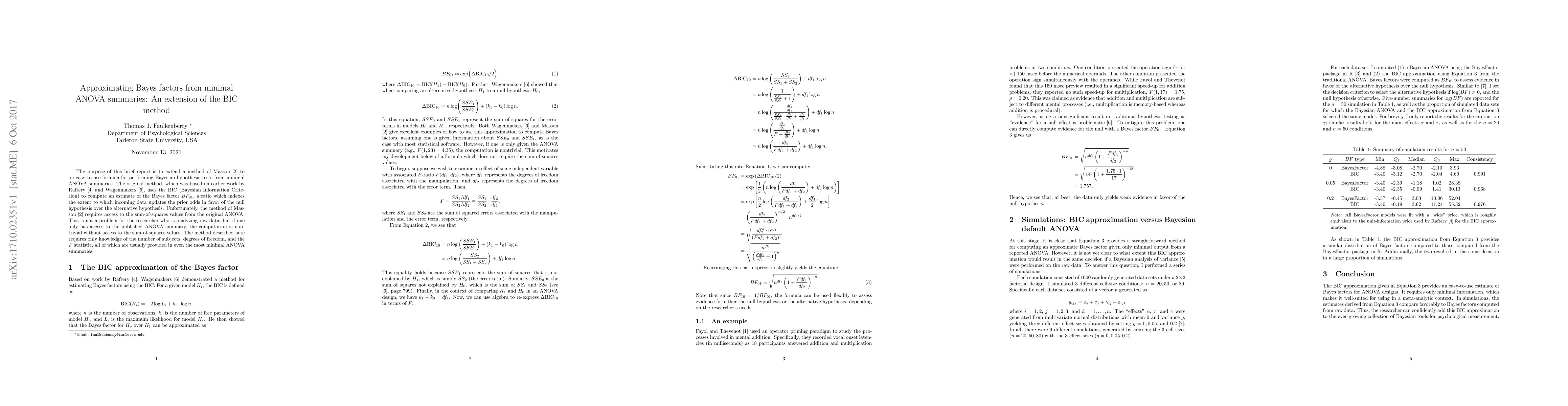 This paper builds on Masson's 2011 method, creating a straightforward formula for Bayesian hypothesis testing using basic ANOVA summary data, making it accessible for non-specialists.