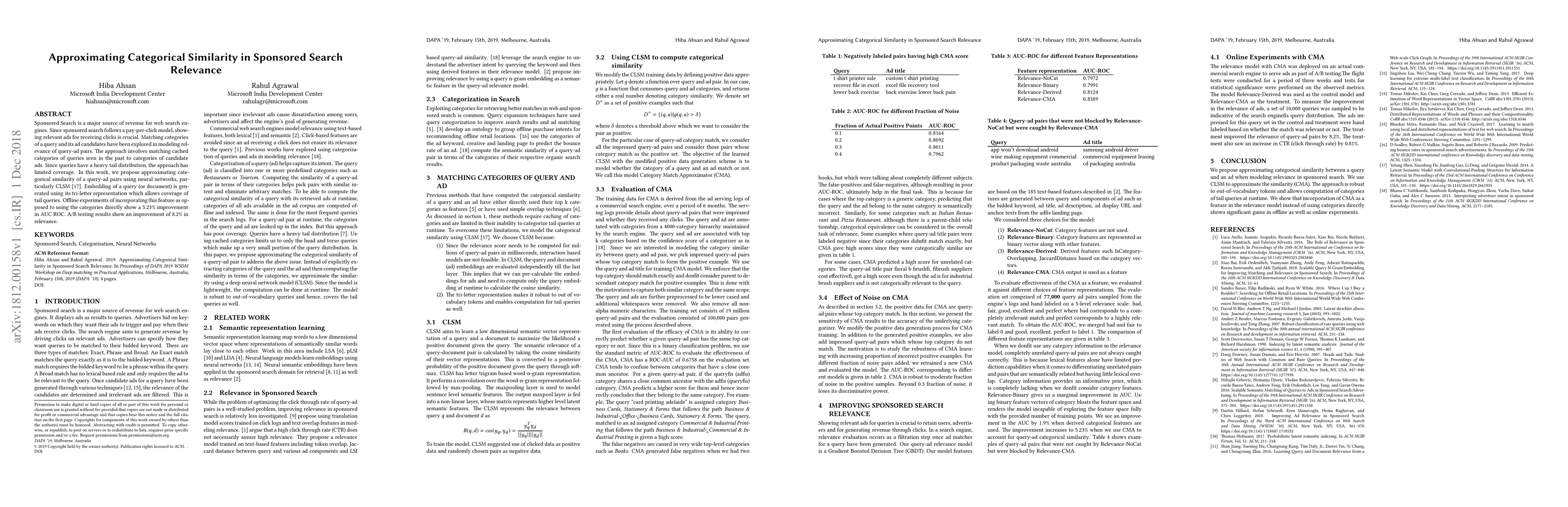 This paper proposes using neural networks, specifically CLSM, to approximate categorical similarity in sponsored search relevance, addressing the limitation of traditional category matching for tail queries. Experimental results show a 5.23% improvement in AUC ROC and an 8.2% increase in relevance through offline and A/B testing.