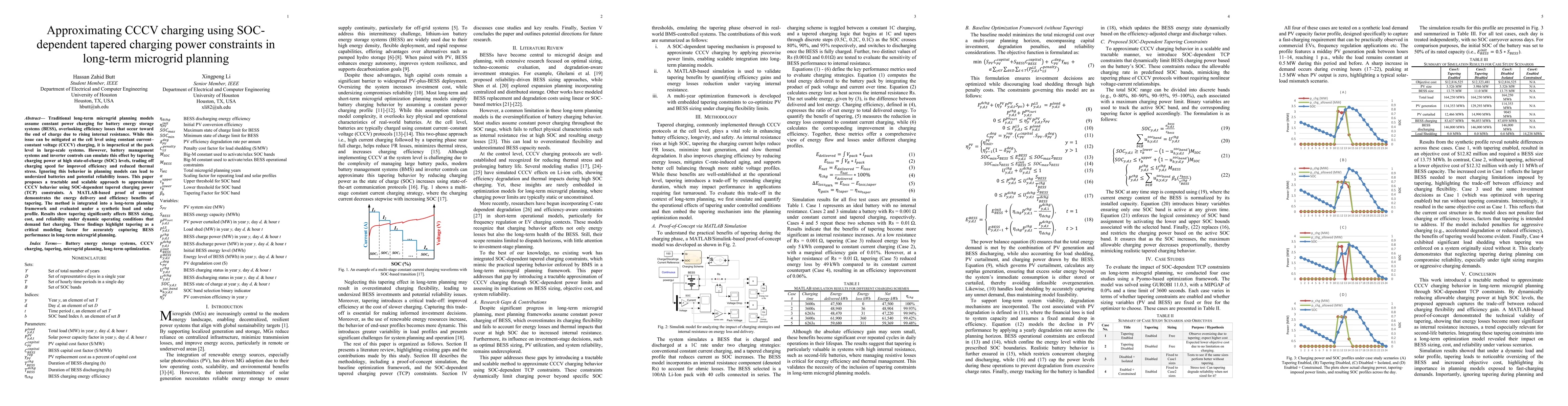Traditional long-term microgrid planning models assume constant power charging for battery energy storage systems (BESS), overlooking efficiency losses that occur toward the end of charge due to rising internal resistance. While this issue can be mitigated at the cell level using constant current-constant voltage (CCCV) charging, it is impractical at the pack level in large-scale systems. However, battery management systems and inverter controls can emulate this effect by tapering charging power at high state-of-charge (SOC) levels, trading off charging speed for improved efficiency and reduced thermal stress. Ignoring this behavior in planning models can lead to undersized batteries and potential reliability issues. This paper proposes a tractable and scalable approach to approximate CCCV behavior using SOC-dependent tapered charging power (TCP) constraints. A MATLAB-based proof of concept demonstrates the energy delivery and efficiency benefits of tapering. The method is integrated into a long-term planning framework and evaluated under a synthetic load and solar profile. Results show tapering significantly affects BESS sizing, cost, and reliability under dynamic operating conditions that demand fast charging. These findings highlight tapering as a critical modeling factor for accurately capturing BESS performance in long-term microgrid planning.
