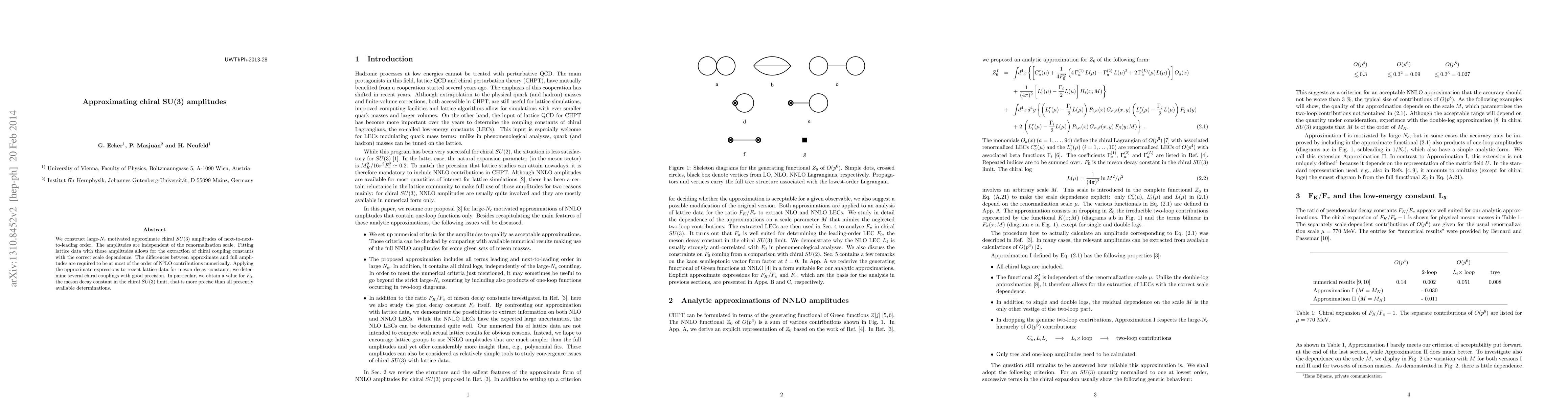 We construct large-N_c motivated approximate chiral SU(3) amplitudes of next-to-next-to-leading order. The amplitudes are independent of the renormalization scale. Fitting lattice data with those amplitudes allows for the extraction of chiral coupling constants with the correct scale dependence. The differences between approximate and full amplitudes are required to be at most of the order of N^3LO contributions numerically. Applying the approximate expressions to recent lattice data for meson decay constants, we determine several chiral couplings with good precision. In particular, we obtain a value for F_0, the meson decay constant in the chiral SU(3) limit, that is more precise than all presently available determinations.