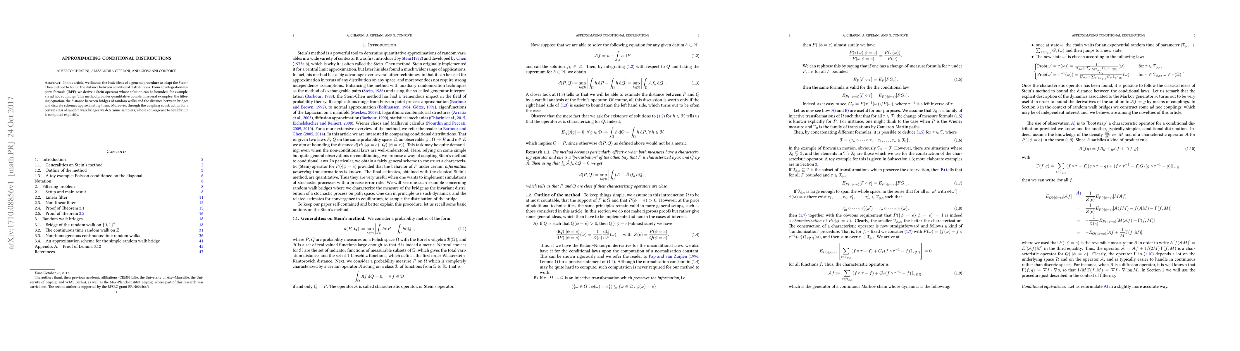 The paper adapts the Stein-Chen method to bound the distance between conditional distributions using an integration-by-parts formula (IBPF) to derive a Stein operator, whose solution is bounded via ad hoc couplings.