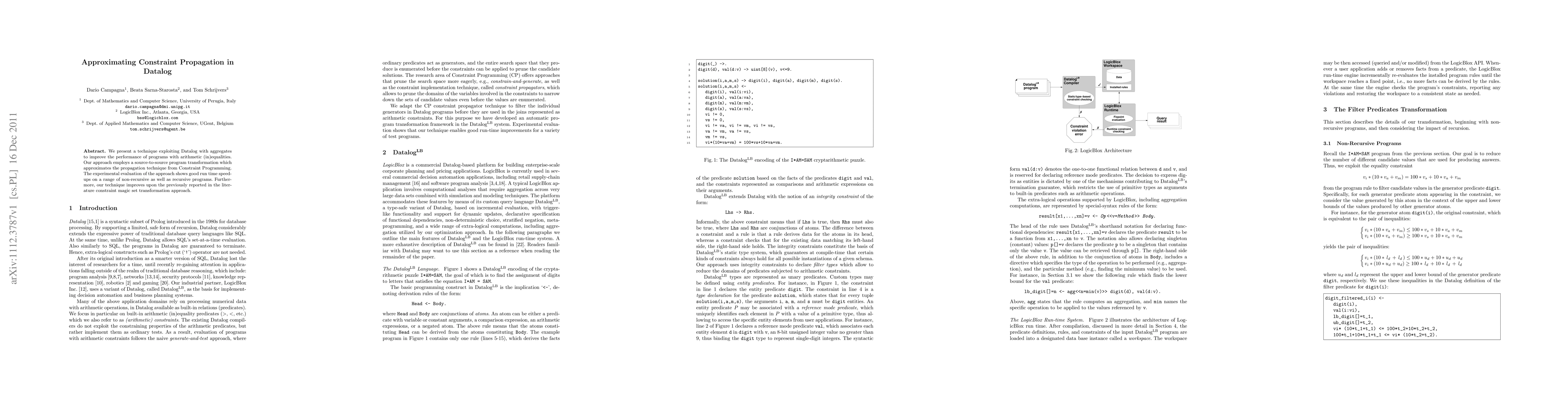 We present a technique exploiting Datalog with aggregates to improve the performance of programs with arithmetic (in)equalities. Our approach employs a source-to-source program transformation which approximates the propagation technique from Constraint Programming. The experimental evaluation of the approach shows good run time speed-ups on a range of non-recursive as well as recursive programs. Furthermore, our technique improves upon the previously reported in the literature constraint magic set transformation approach.