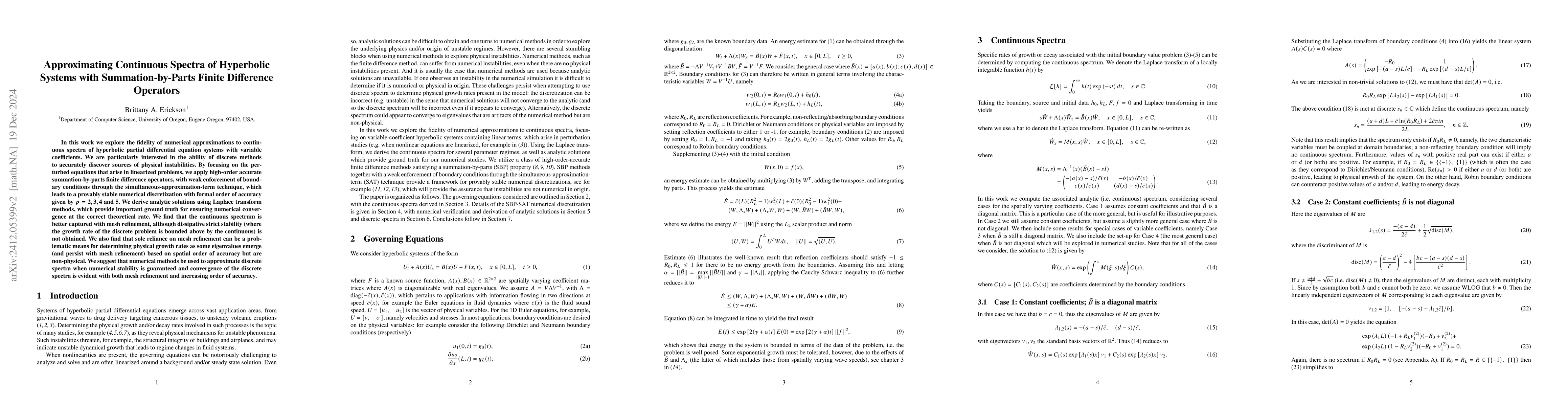 In this work we explore the fidelity of numerical approximations to continuous spectra of hyperbolic partial differential equation systems. We are particularly interested in the ability of discrete methods to accurately discover sources of physical instabilities. By focusing on the perturbed equations that arise in linearized problems, we apply high-order accurate summation-by-parts finite difference operators, with weak enforcement of boundary conditions through the simulataneous-approximation-term technique, which leads to a provably stable numerical discretization with formal order of accuracy given by $p = 2, 3, 4$ and $5$. We derive analytic solutions using Laplace transform methods, which provide important ground truth for ensuring numerical convergence at the correct theoretical rate. We find that the continuous spectrum is better captured with mesh refinement, although dissipative strict stability (where the growth rate of the discrete problem is bounded above by the continuous) is not obtained. However, we also find that sole reliance on mesh refinement can be a problematic means for determining physical growth rates as some eigenvalues emerge (and persist with mesh refinement) based on spatial order of accuracy but are non-physical. We suggest that numerical methods be used to approximate discrete spectra when numerical stability is guaranteed and convergence of the discrete spectra is evident with both mesh refinement and increasing order of accuracy.