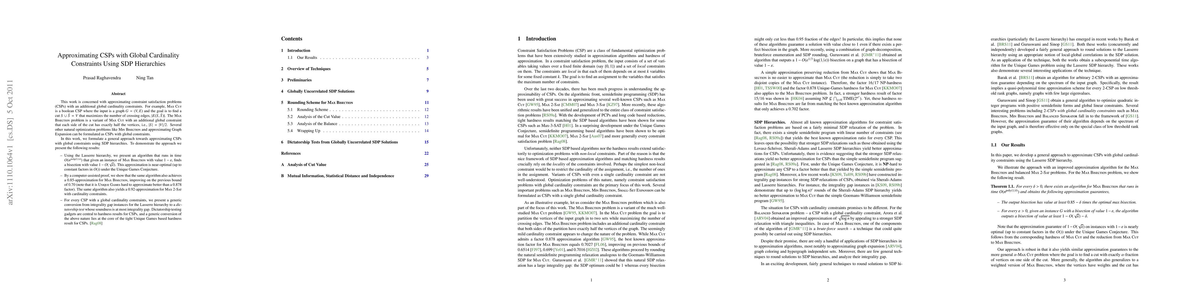 This work is concerned with approximating constraint satisfaction problems (CSPs) with an additional global cardinality constraints. For example, \maxcut is a boolean CSP where the input is a graph $G = (V,E)$ and the goal is to find a cut $S \cup \bar S = V$ that maximizes the numberof crossing edges, $|E(S,\bar S)|$. The \maxbisection problem is a variant of \maxcut with an additional global constraint that each side of the cut has exactly half the vertices, i.e., $|S| = |V|/2$. Several other natural optimization problems like \minbisection and approximating Graph Expansion can be formulated as CSPs with global constraints. In this work, we formulate a general approach towards approximating CSPs with global constraints using SDP hierarchies. To demonstrate the approach we present the following results: Using the Lasserre hierarchy, we present an algorithm that runs in time $O(n^{poly(1/\epsilon)})$ that given an instance of \maxbisection with value $1-\epsilon$, finds a bisection with value $1-O(\sqrt{\epsilon})$. This approximation is near-optimal (up to constant factors in $O()$) under the Unique Games Conjecture. By a computer-assisted proof, we show that the same algorithm also achieves a 0.85-approximation for \maxbisection, improving on the previous bound of 0.70 (note that it is \uniquegames hard to approximate better than a 0.878 factor). The same algorithm also yields a 0.92-approximation for \maxtwosat with cardinality constraints. For every CSP with a global cardinality constraints, we present a generic conversion from integrality gap instances for the Lasserre hierarchy to a {\it dictatorship test} whose soundness is at most integrality gap. Dictatorship testing gadgets are central to hardness results for CSPs, and a generic conversion of the above nature lies at the core of the tight Unique Games based hardness result for CSPs. \cite{Raghavendra08}