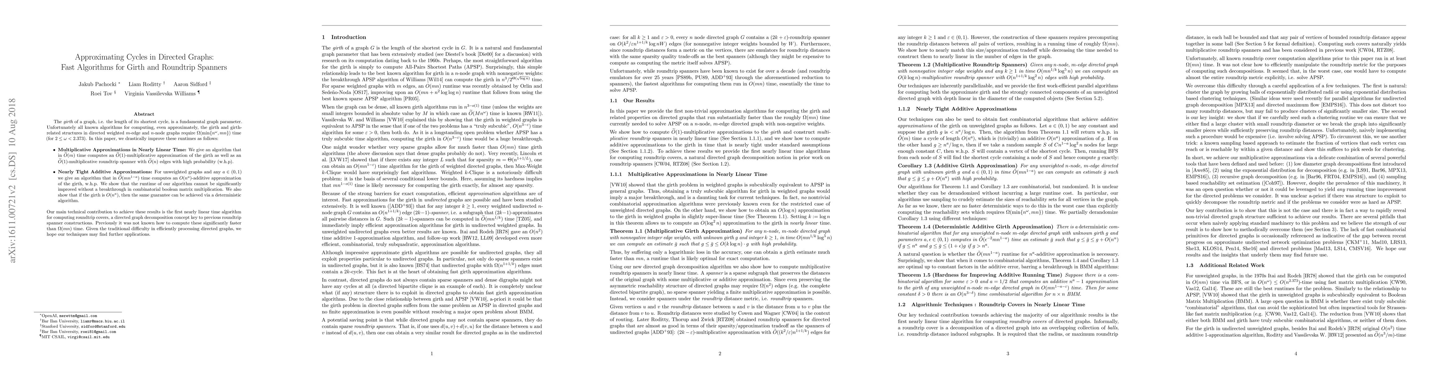 This paper presents fast algorithms for approximating the girth of directed graphs and constructing roundtrip spanners. The authors achieve nearly linear time for multiplicative approximations and nearly tight additive approximations, leveraging a new nearly linear time algorithm for computing roundtrip covers.