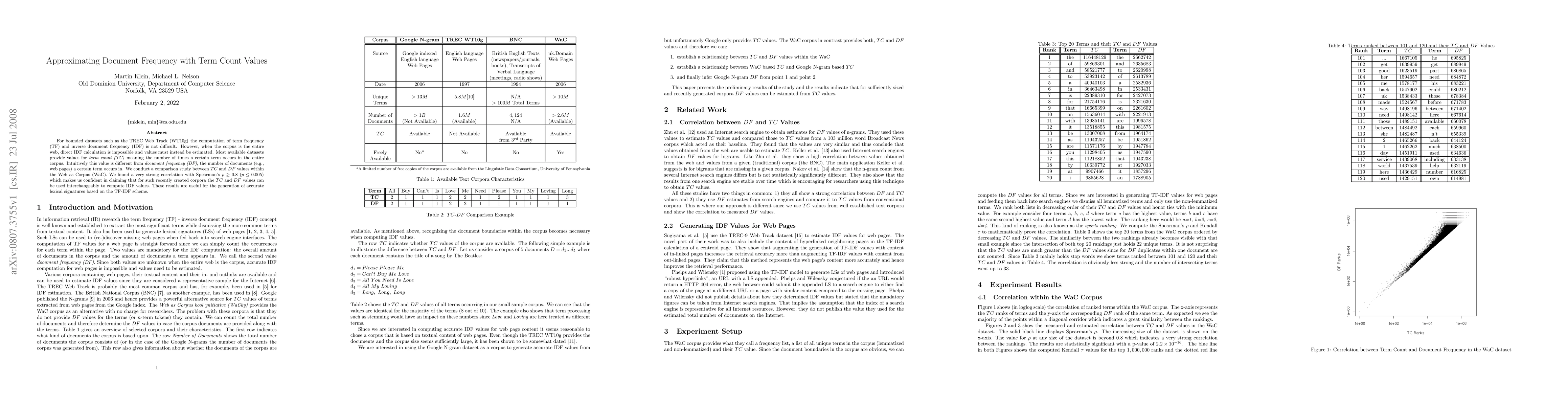 For bounded datasets such as the TREC Web Track (WT10g) the computation of term frequency (TF) and inverse document frequency (IDF) is not difficult. However, when the corpus is the entire web, direct IDF calculation is impossible and values must instead be estimated. Most available datasets provide values for term count (TC) meaning the number of times a certain term occurs in the entire corpus. Intuitively this value is different from document frequency (DF), the number of documents (e.g., web pages) a certain term occurs in. We conduct a comparison study between TC and DF values within the Web as Corpus (WaC). We found a very strong correlation with Spearman's rho >0.8 (p<0.005) which makes us confident in claiming that for such recently created corpora the TC and DF values can be used interchangeably to compute IDF values. These results are useful for the generation of accurate lexical signatures based on the TF-IDF scheme.