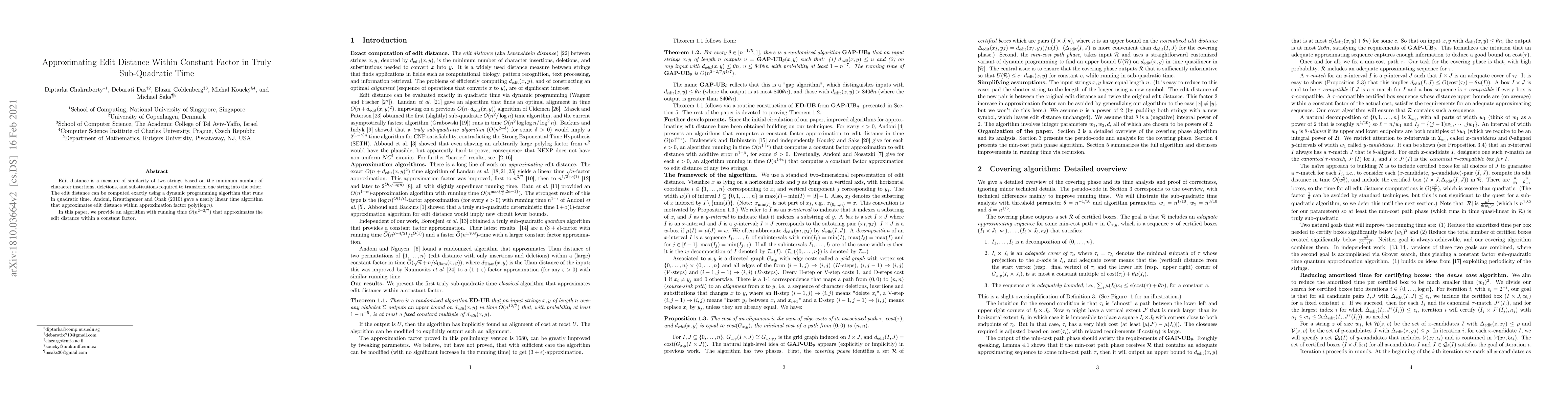 Edit distance is a measure of similarity of two strings based on the minimum number of character insertions, deletions, and substitutions required to transform one string into the other. The edit distance can be computed exactly using a dynamic programming algorithm that runs in quadratic time. Andoni, Krauthgamer, and Onak (2010) gave a nearly linear time algorithm that approximates edit distance within an approximation factor $\text{poly}(\log n)$. In this paper, we provide an algorithm with running time $\tilde{O}(n^{2-2/7})$ that approximates the edit distance within a constant factor.