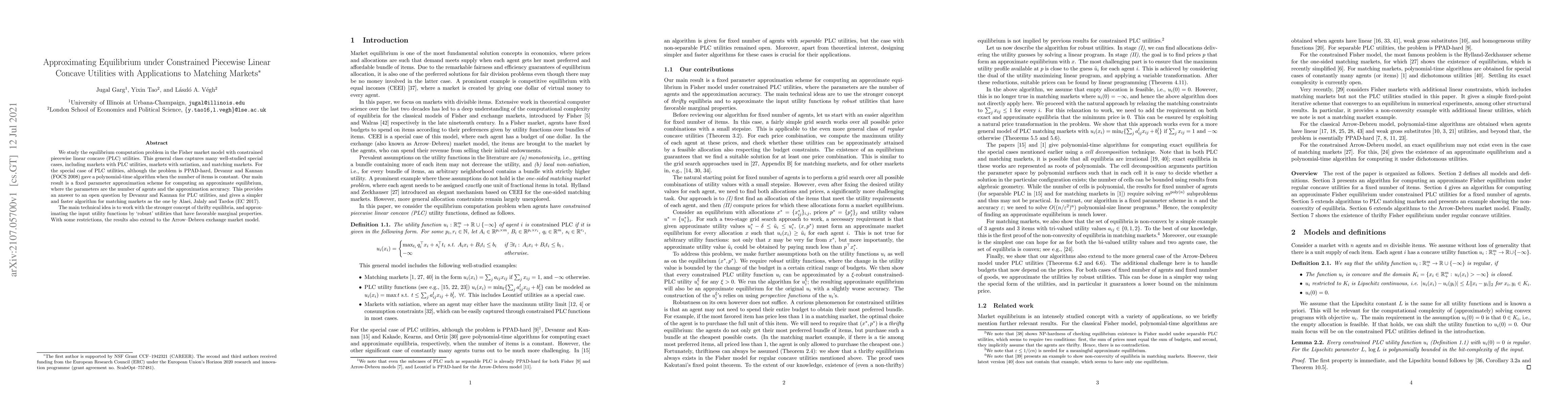 We study the equilibrium computation problem in the Fisher market model with constrained piecewise linear concave (PLC) utilities. This general class captures many well-studied special cases, including markets with PLC utilities, markets with satiation, and matching markets. For the special case of PLC utilities, although the problem is PPAD-hard, Devanur and Kannan (FOCS 2008) gave a polynomial-time algorithm when the number of items is constant. Our main result is a fixed parameter approximation scheme for computing an approximate equilibrium, where the parameters are the number of agents and the approximation accuracy. This provides an answer to an open question by Devanur and Kannan for PLC utilities, and gives a simpler and faster algorithm for matching markets as the one by Alaei, Jalaly and Tardos (EC 2017). The main technical idea is to work with the stronger concept of thrifty equilibria, and approximating the input utility functions by `robust' utilities that have favorable marginal properties. With some restrictions, the results also extend to the Arrow--Debreu exchange market model.
