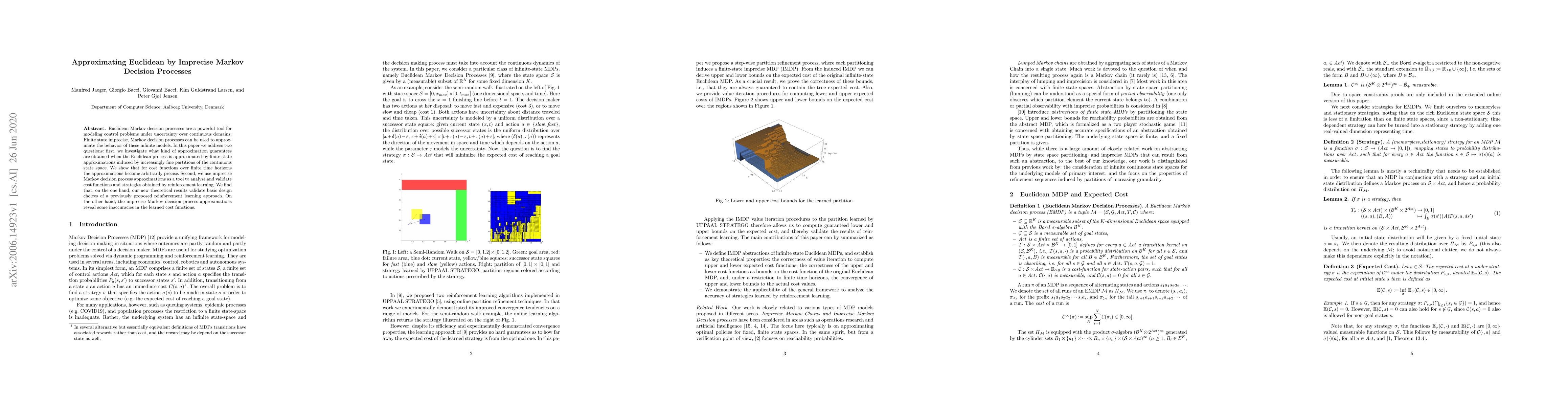 Euclidean Markov decision processes are a powerful tool for modeling control problems under uncertainty over continuous domains. Finite state imprecise, Markov decision processes can be used to approximate the behavior of these infinite models. In this paper we address two questions: first, we investigate what kind of approximation guarantees are obtained when the Euclidean process is approximated by finite state approximations induced by increasingly fine partitions of the continuous state space. We show that for cost functions over finite time horizons the approximations become arbitrarily precise. Second, we use imprecise Markov decision process approximations as a tool to analyse and validate cost functions and strategies obtained by reinforcement learning. We find that, on the one hand, our new theoretical results validate basic design choices of a previously proposed reinforcement learning approach. On the other hand, the imprecise Markov decision process approximations reveal some inaccuracies in the learned cost functions.