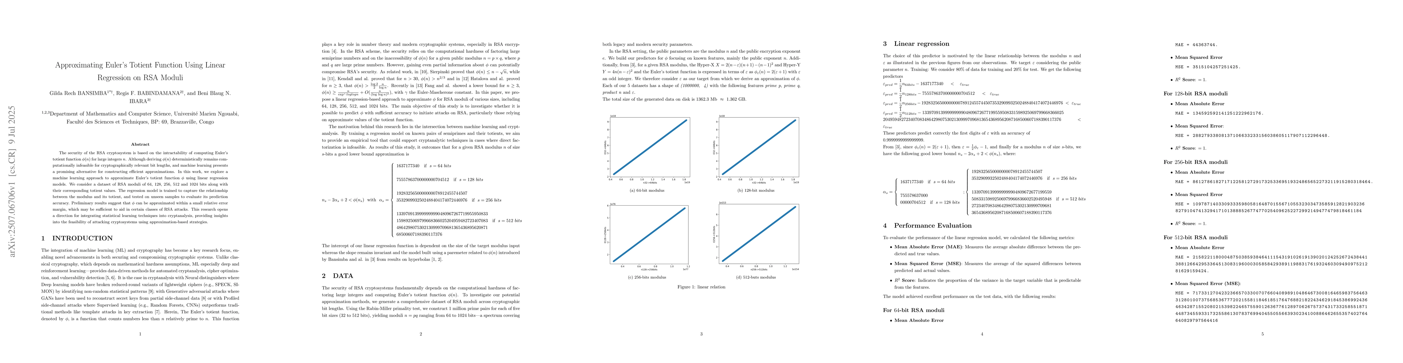 The security of the RSA cryptosystem is based on the intractability of computing Euler's totient function phi(n) for large integers n. Although deriving phi(n) deterministically remains computationally infeasible for cryptographically relevant bit lengths, and machine learning presents a promising alternative for constructing efficient approximations. In this work, we explore a machine learning approach to approximate Euler's totient function phi using linear regression models. We consider a dataset of RSA moduli of 64, 128, 256, 512 and 1024 bits along with their corresponding totient values. The regression model is trained to capture the relationship between the modulus and its totient, and tested on unseen samples to evaluate its prediction accuracy. Preliminary results suggest that phi can be approximated within a small relative error margin, which may be sufficient to aid in certain classes of RSA attacks. This research opens a direction for integrating statistical learning techniques into cryptanalysis, providing insights into the feasibility of attacking cryptosystems using approximation based strategies.
