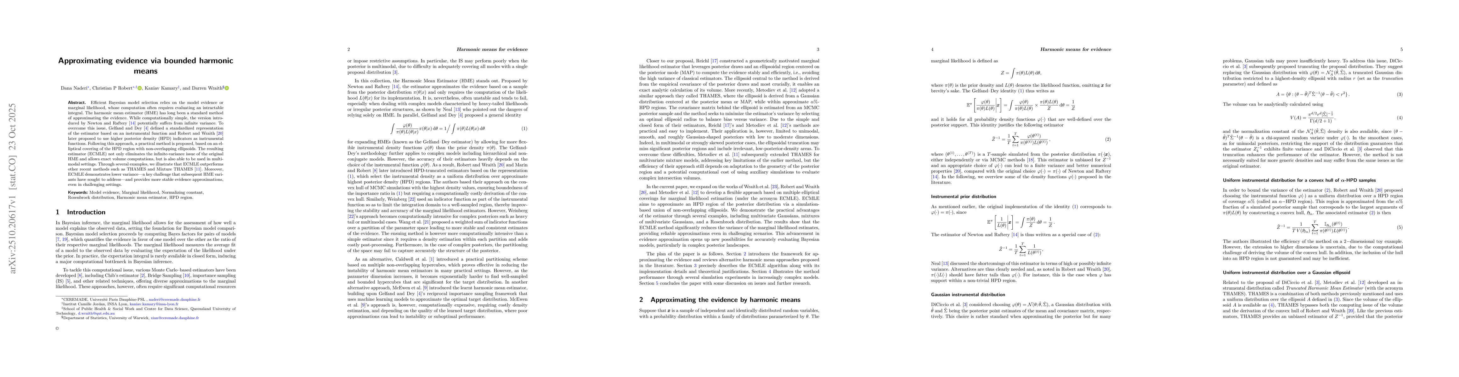 The paper develops a novel approach to compute model evidence by combining harmonic mean estimation with non-overlapping ellipsoids covering HPD regions, enabling exact volume computations and improved stability.