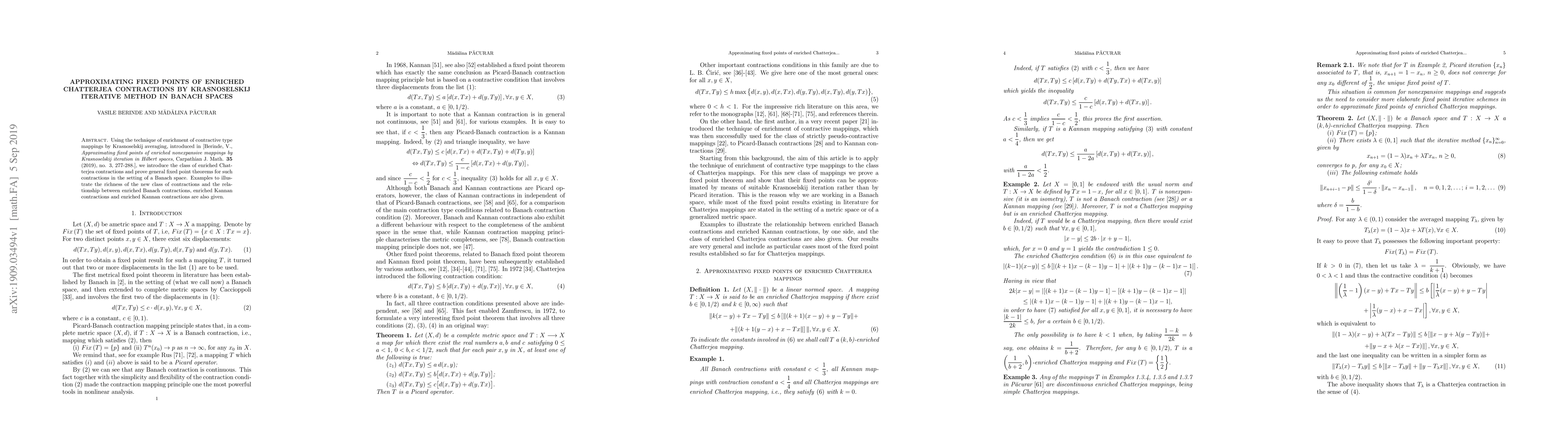 This paper introduces enriched Chatterjea contractions and proves fixed point theorems for them in Banach spaces using Krasnoselskij iterative methods. It also explores the relationship between various enriched contraction classes and provides illustrative examples.