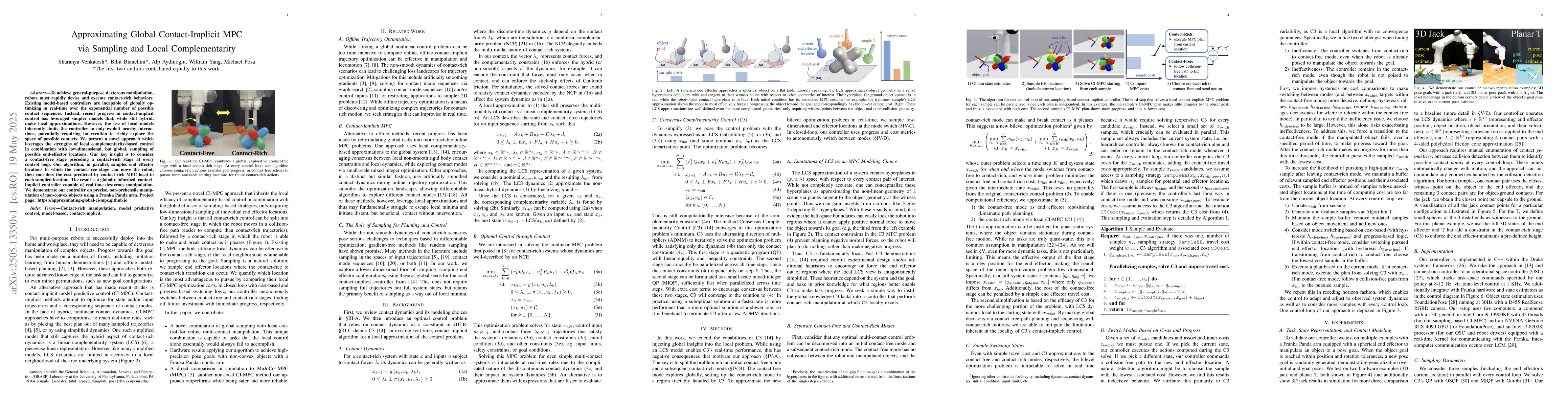 The paper presents a hybrid controller that merges global sampling with local complementarity-based control, enabling real-time contact-implicit manipulation.