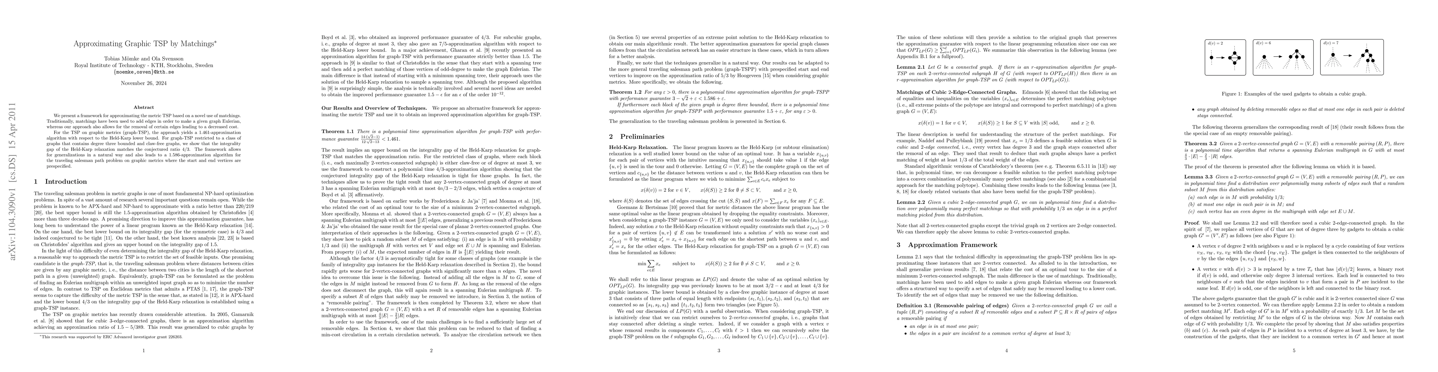 We present a framework for approximating the metric TSP based on a novel use of matchings. Traditionally, matchings have been used to add edges in order to make a given graph Eulerian, whereas our approach also allows for the removal of certain edges leading to a decreased cost. For the TSP on graphic metrics (graph-TSP), the approach yields a 1.461-approximation algorithm with respect to the Held-Karp lower bound. For graph-TSP restricted to a class of graphs that contains degree three bounded and claw-free graphs, we show that the integrality gap of the Held-Karp relaxation matches the conjectured ratio 4/3. The framework allows for generalizations in a natural way and also leads to a 1.586-approximation algorithm for the traveling salesman path problem on graphic metrics where the start and end vertices are prespecified.