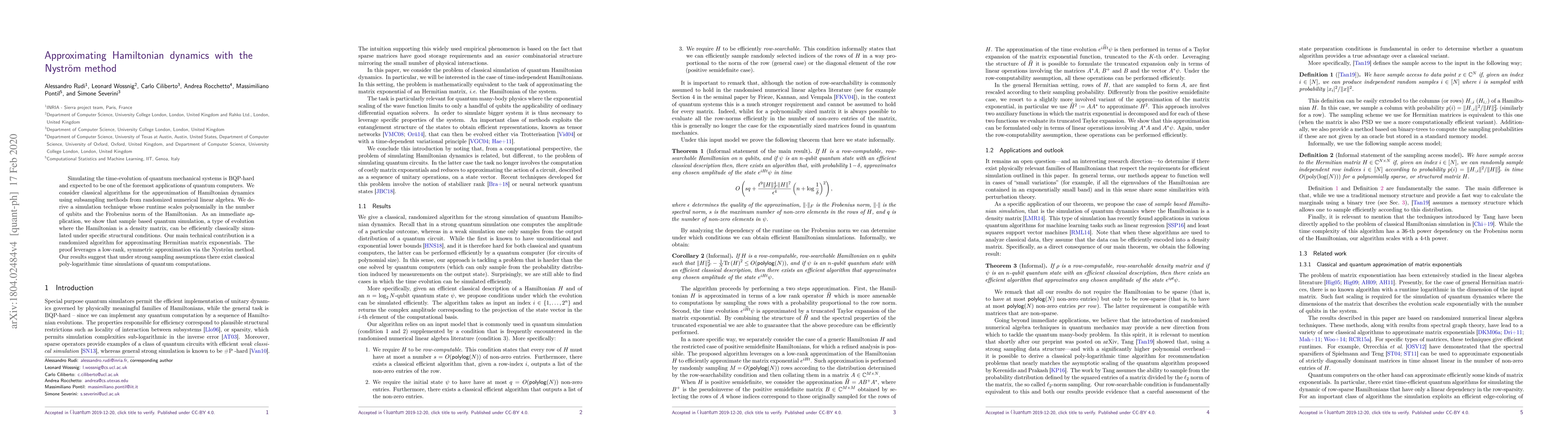 Simulating the time-evolution of quantum mechanical systems is BQP-hard and expected to be one of the foremost applications of quantum computers. We consider classical algorithms for the approximation of Hamiltonian dynamics using subsampling methods from randomized numerical linear algebra. We derive a simulation technique whose runtime scales polynomially in the number of qubits and the Frobenius norm of the Hamiltonian. As an immediate application, we show that sample based quantum simulation, a type of evolution where the Hamiltonian is a density matrix, can be efficiently classically simulated under specific structural conditions. Our main technical contribution is a randomized algorithm for approximating Hermitian matrix exponentials. The proof leverages a low-rank, symmetric approximation via the Nystr\"om method. Our results suggest that under strong sampling assumptions there exist classical poly-logarithmic time simulations of quantum computations.
