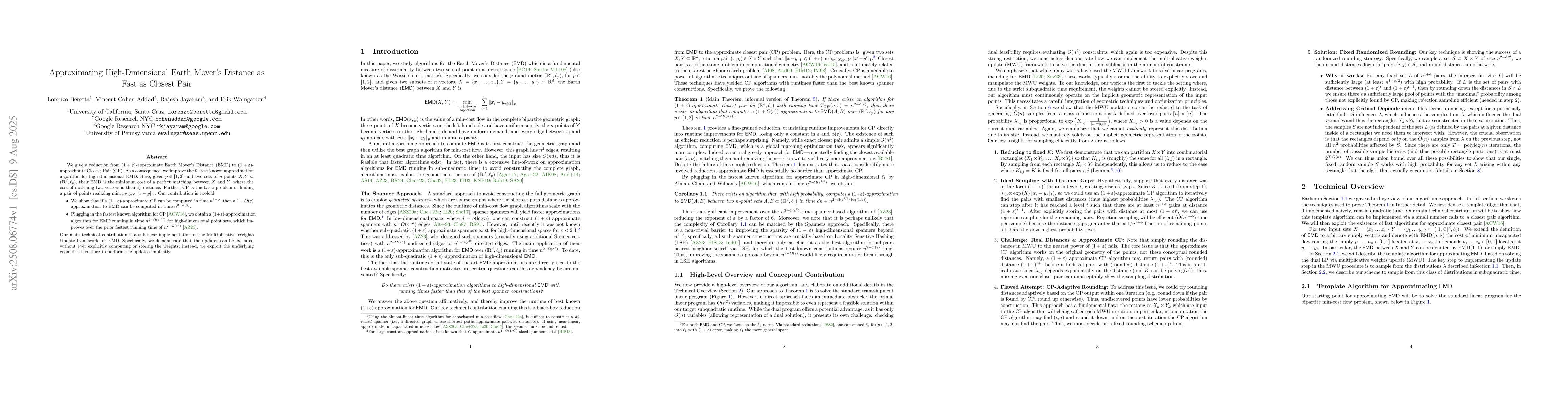 The paper employs a reduction from $(1+\varepsilon)$-approximate Earth Mover's Distance (EMD) to $(1+\varepsilon)$-approximate Closest Pair (CP), improving the fastest known approximation algorithm for high-dimensional EMD.