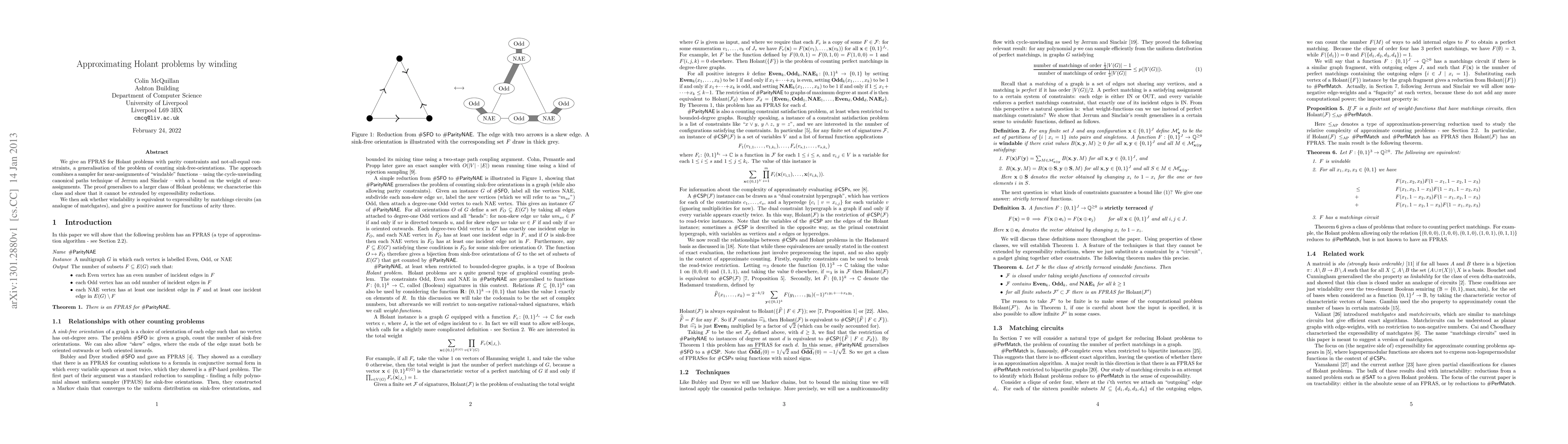 We give an FPRAS for Holant problems with parity constraints and not-all-equal constraints, a generalisation of the problem of counting sink-free-orientations. The approach combines a sampler for near-assignments of "windable" functions -- using the cycle-unwinding canonical paths technique of Jerrum and Sinclair -- with a bound on the weight of near-assignments. The proof generalises to a larger class of Holant problems; we characterise this class and show that it cannot be extended by expressibility reductions. We then ask whether windability is equivalent to expressibility by matchings circuits (an analogue of matchgates), and give a positive answer for functions of arity three.
