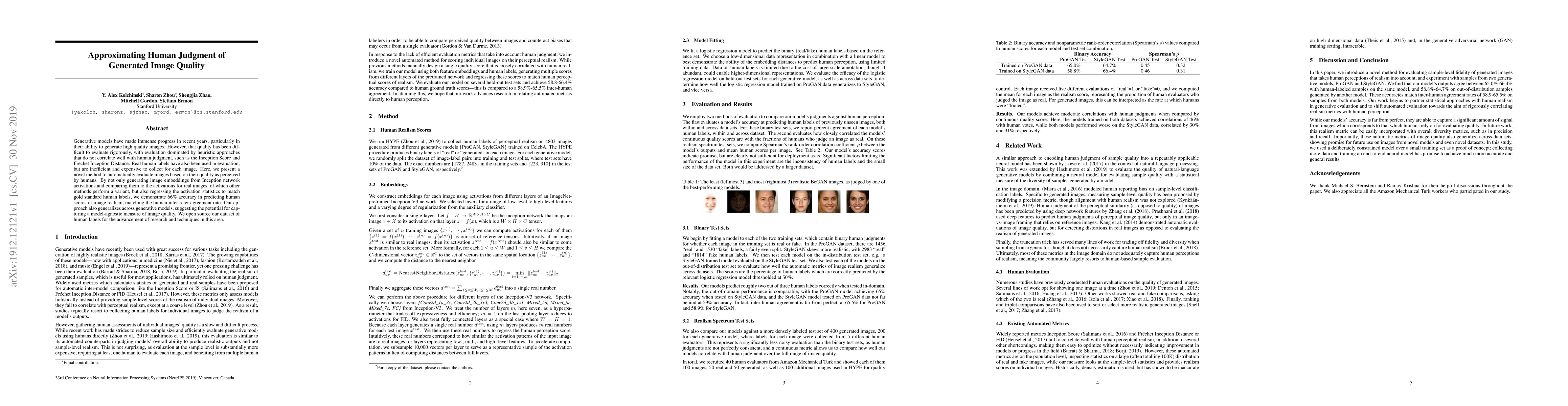 Generative models have made immense progress in recent years, particularly in their ability to generate high quality images. However, that quality has been difficult to evaluate rigorously, with evaluation dominated by heuristic approaches that do not correlate well with human judgment, such as the Inception Score and Fr\'echet Inception Distance. Real human labels have also been used in evaluation, but are inefficient and expensive to collect for each image. Here, we present a novel method to automatically evaluate images based on their quality as perceived by humans. By not only generating image embeddings from Inception network activations and comparing them to the activations for real images, of which other methods perform a variant, but also regressing the activation statistics to match gold standard human labels, we demonstrate 66% accuracy in predicting human scores of image realism, matching the human inter-rater agreement rate. Our approach also generalizes across generative models, suggesting the potential for capturing a model-agnostic measure of image quality. We open source our dataset of human labels for the advancement of research and techniques in this area.