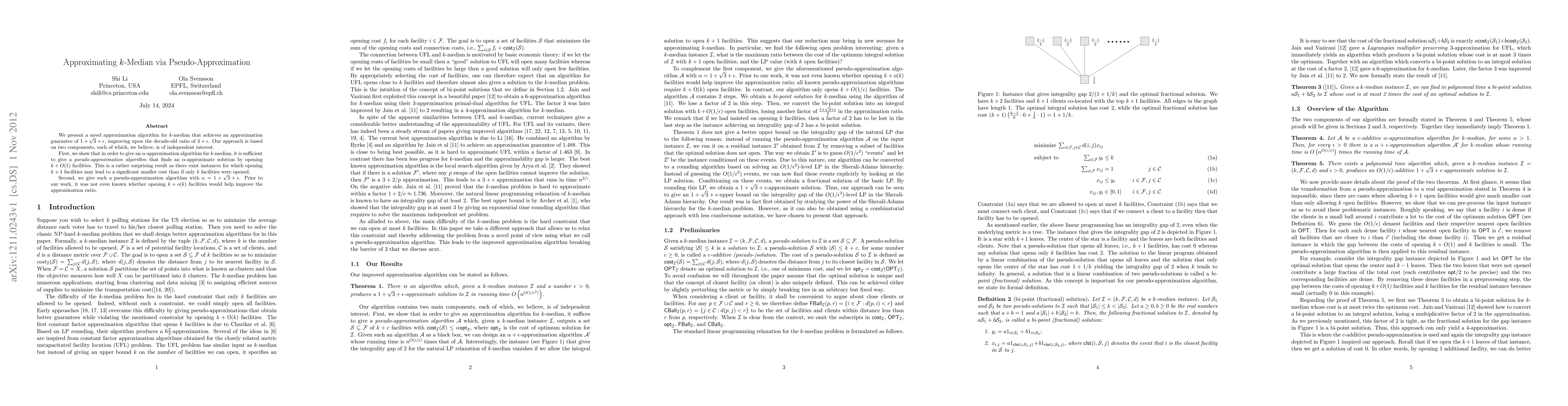 This paper introduces an algorithm to approximate k-median with a ratio of $1+rac{ heta}{ ext{square}}$, improving upon the previous 3+\epsilon$ratio, by reducing the number of facilities needed.