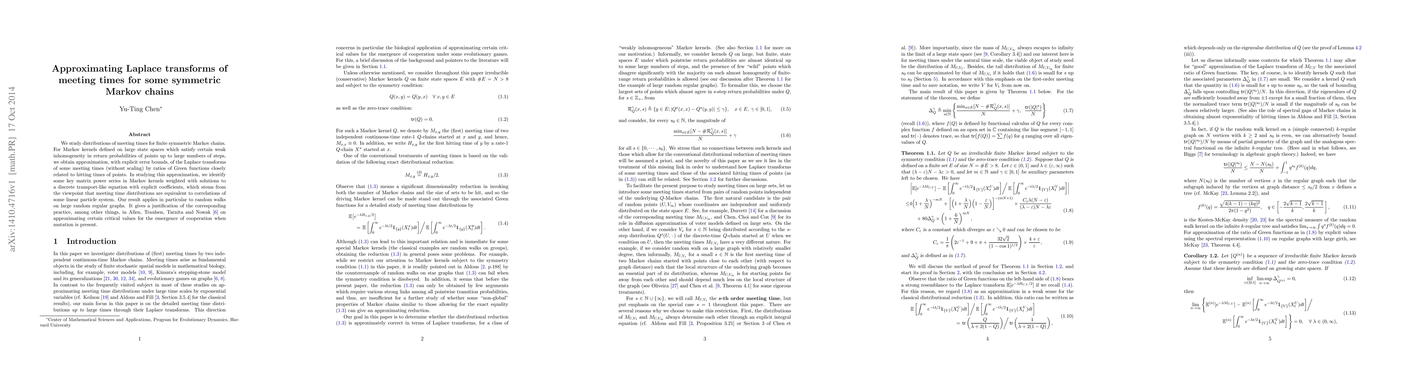 This paper approximates Laplace transforms of meeting times for finite symmetric Markov chains, providing explicit error bounds. It identifies key matrix power series and applies the results to random walks on large random regular graphs, justifying practices used in studying cooperation emergence with mutation.