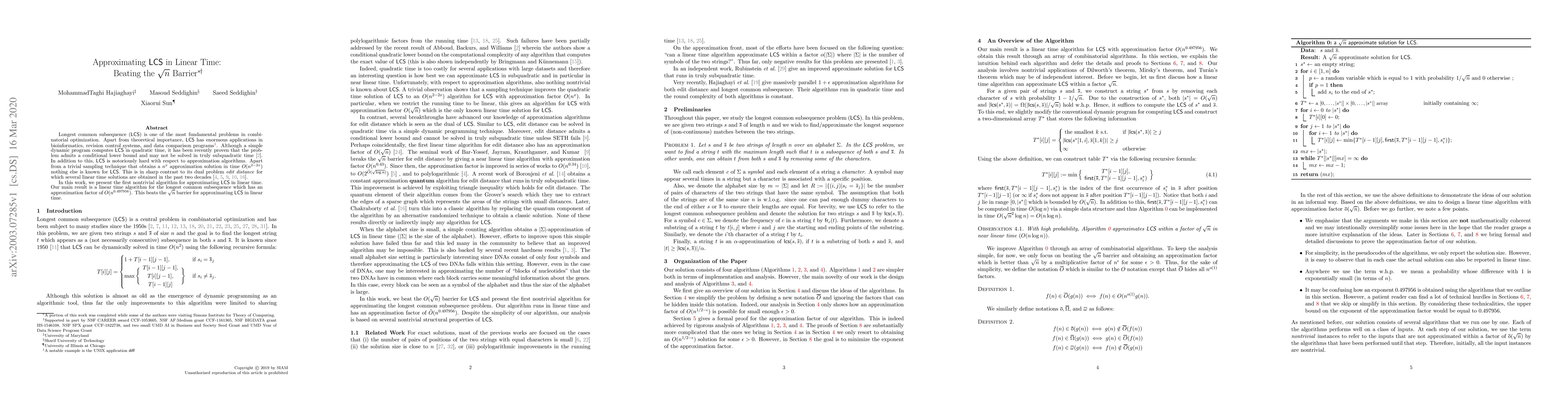 Longest common subsequence (LCS) is one of the most fundamental problems in combinatorial optimization. Apart from theoretical importance, LCS has enormous applications in bioinformatics, revision control systems, and data comparison programs. Although a simple dynamic program computes LCS in quadratic time, it has been recently proven that the problem admits a conditional lower bound and may not be solved in truly subquadratic time. In addition to this, LCS is notoriously hard with respect to approximation algorithms. Apart from a trivial sampling technique that obtains a $n^{x}$ approximation solution in time $O(n^{2-2x})$ nothing else is known for LCS. This is in sharp contrast to its dual problem edit distance for which several linear time solutions are obtained in the past two decades.