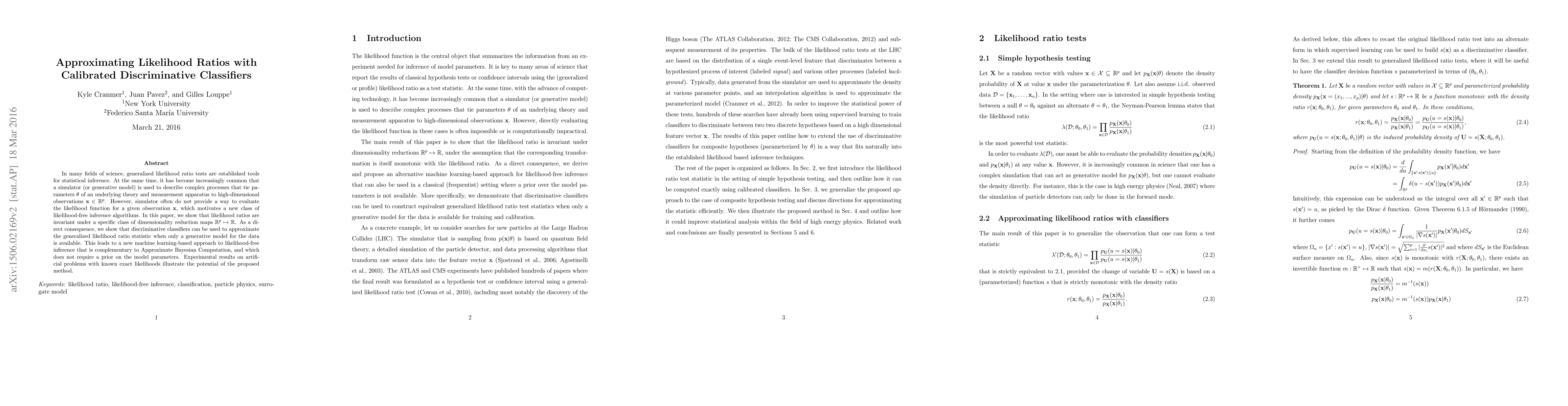 This paper proposes a novel method for approximating likelihood ratios using calibrated discriminative classifiers when a generative model is available but the likelihood function cannot be directly evaluated. The authors demonstrate that likelihood ratios remain invariant under certain dimensionality reduction maps, enabling the use of classifiers for likelihood-free inference without requiring priors on model parameters.