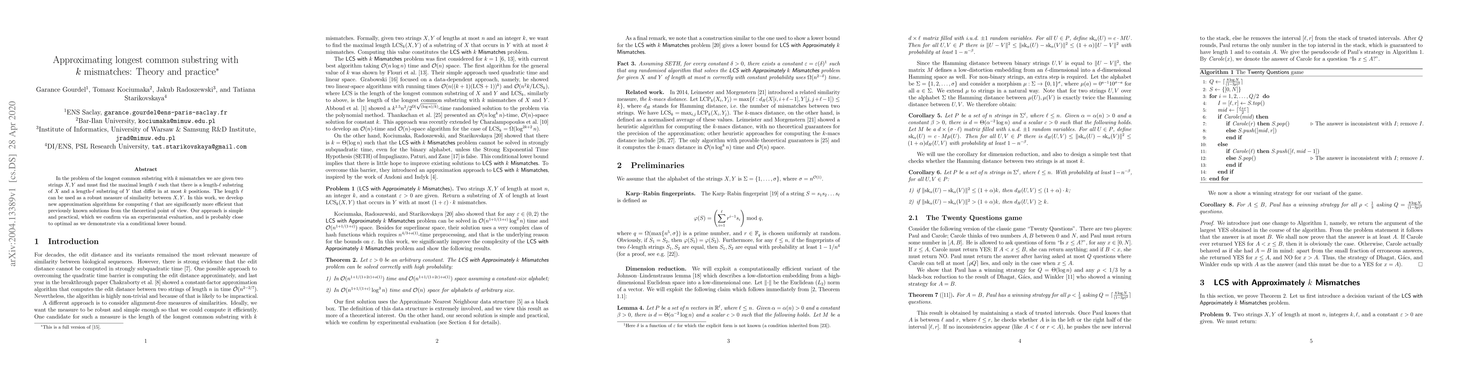The paper introduces novel algorithms and a data structure for approximating the longest common substring with k mismatches, improving upon previous theoretical solutions in terms of efficiency.