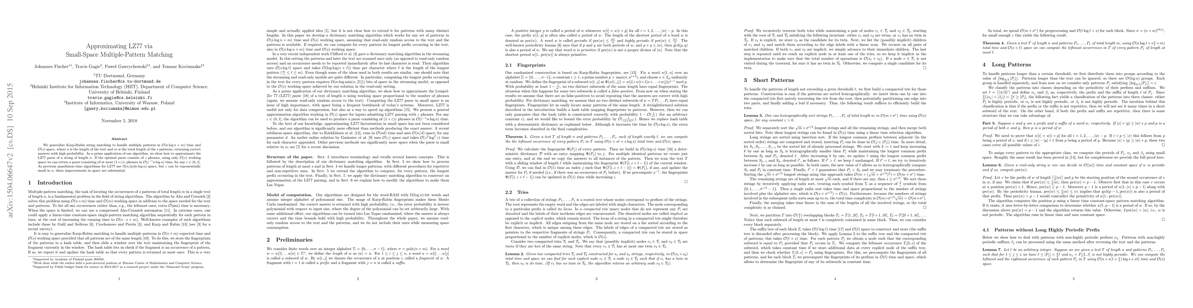 The paper generalizes Karp-Rabin string matching to handle multiple patterns efficiently in O(n log n + m) time and O(s) space, using finger-printing techniques and a deterministic dictionary. It applies this algorithm to approximate LZ77 parsing, returning a parse with at most (1+ε)z phrases in O(ε^(-1)n log n) time, where z is the number of phrases in the optimal LZ77 parse.