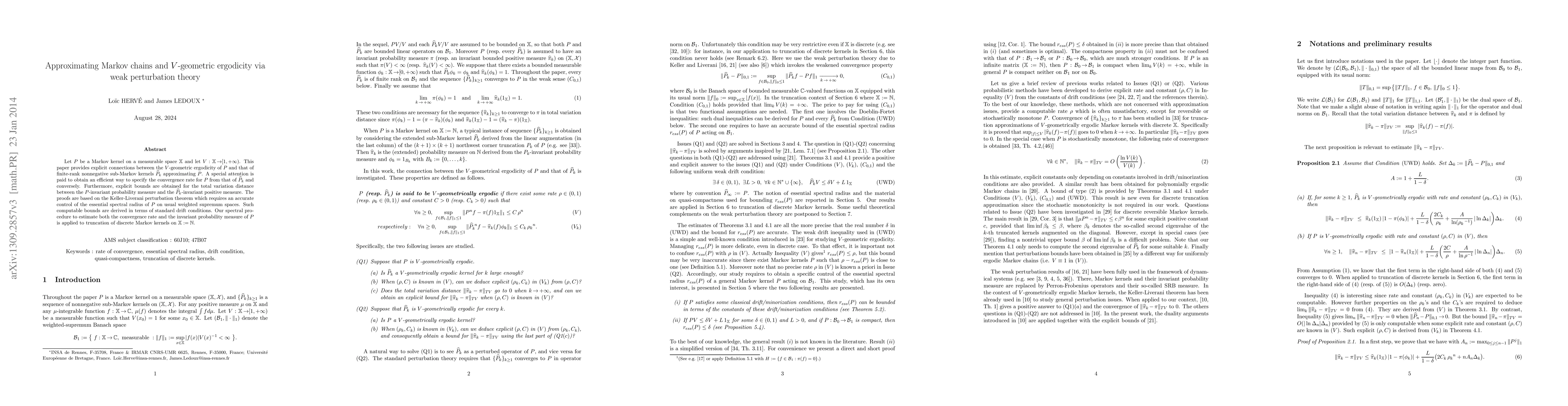 Let $P$ be a Markov kernel on a measurable space $\X$ and let $V:\X\r[1,+\infty)$. This paper provides explicit connections between the $V$-geometric ergodicity of $P$ and that of finite-rank nonnegative sub-Markov kernels $\Pc_k$ approximating $P$. A special attention is paid to obtain an efficient way to specify the convergence rate for $P$ from that of $\Pc_k$ and conversely. Furthermore, explicit bounds are obtained for the total variation distance between the $P$-invariant probability measure and the $\Pc_k$-invariant positive measure. The proofs are based on the Keller-Liverani perturbation theorem which requires an accurate control of the essential spectral radius of $P$ on usual weighted supremum spaces. Such computable bounds are derived in terms of standard drift conditions. Our spectral procedure to estimate both the convergence rate and the invariant probability measure of $P$ is applied to truncation of discrete Markov kernels on $\X:=\N$.