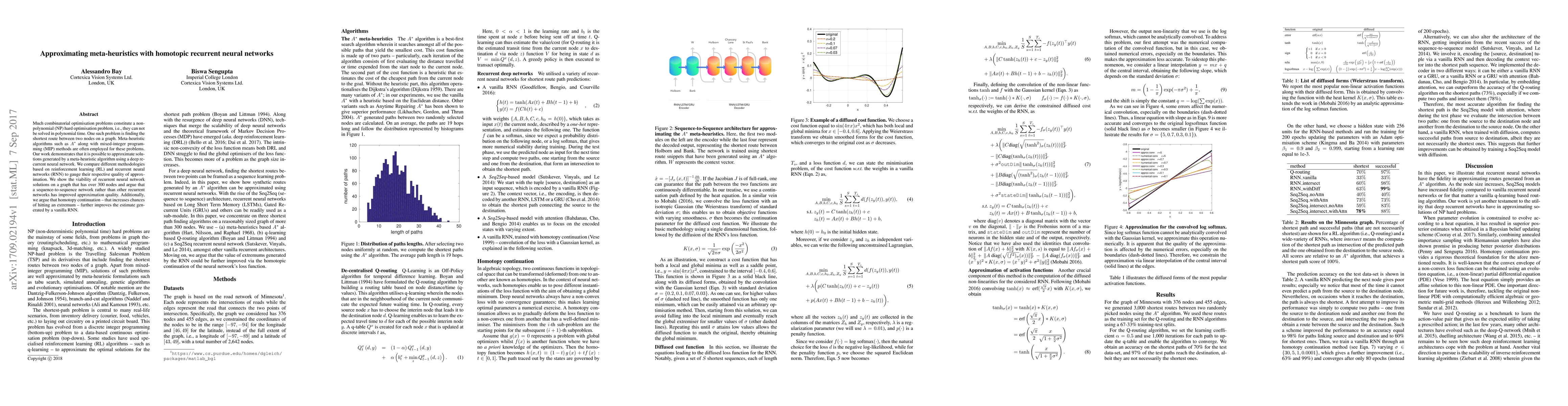 Much combinatorial optimisation problems constitute a non-polynomial (NP) hard optimisation problem, i.e., they can not be solved in polynomial time. One such problem is finding the shortest route between two nodes on a graph. Meta-heuristic algorithms such as $A^{*}$ along with mixed-integer programming (MIP) methods are often employed for these problems. Our work demonstrates that it is possible to approximate solutions generated by a meta-heuristic algorithm using a deep recurrent neural network. We compare different methodologies based on reinforcement learning (RL) and recurrent neural networks (RNN) to gauge their respective quality of approximation. We show the viability of recurrent neural network solutions on a graph that has over 300 nodes and argue that a sequence-to-sequence network rather than other recurrent networks has improved approximation quality. Additionally, we argue that homotopy continuation -- that increases chances of hitting an extremum -- further improves the estimate generated by a vanilla RNN.